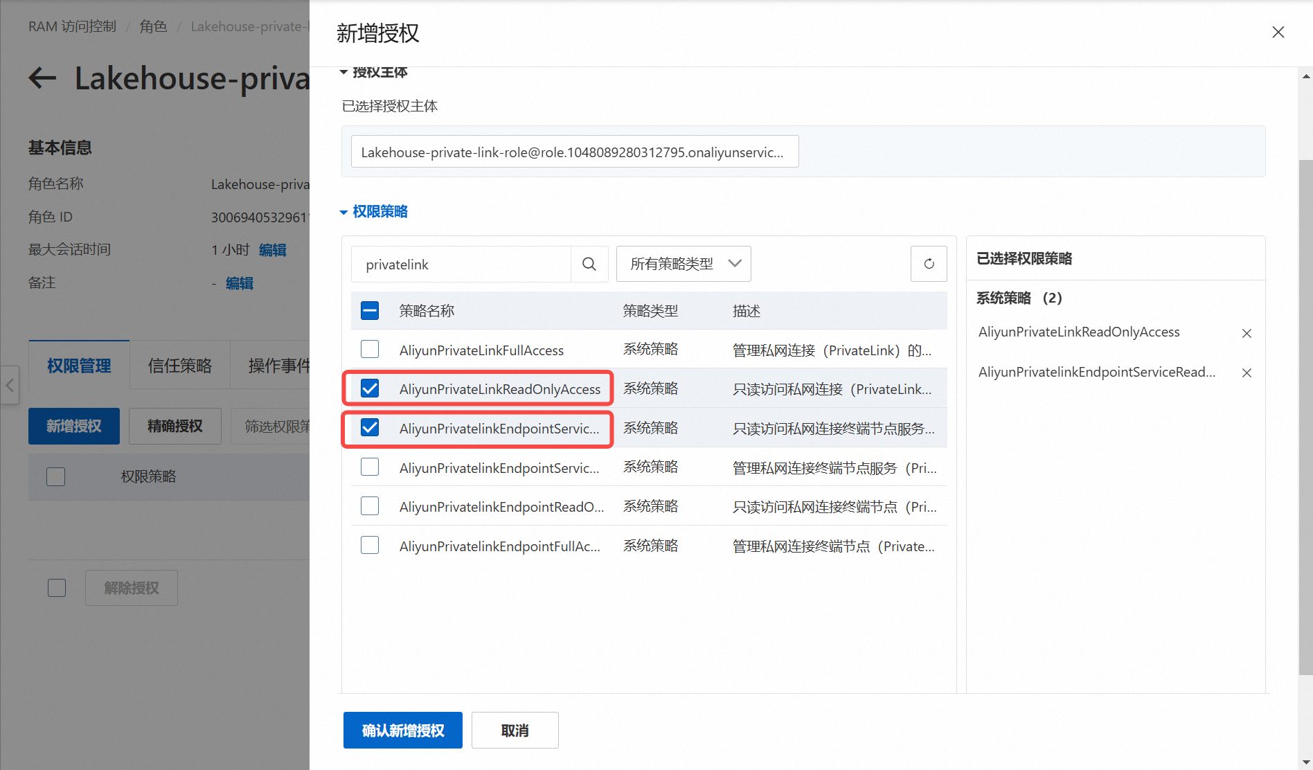 搜索“privatelink”,并勾选:AliyunPrivateLinkReadOnlyAccess 和 AliyunPrivatelinkEndpointServiceReadOnlyAccess 两个策略;