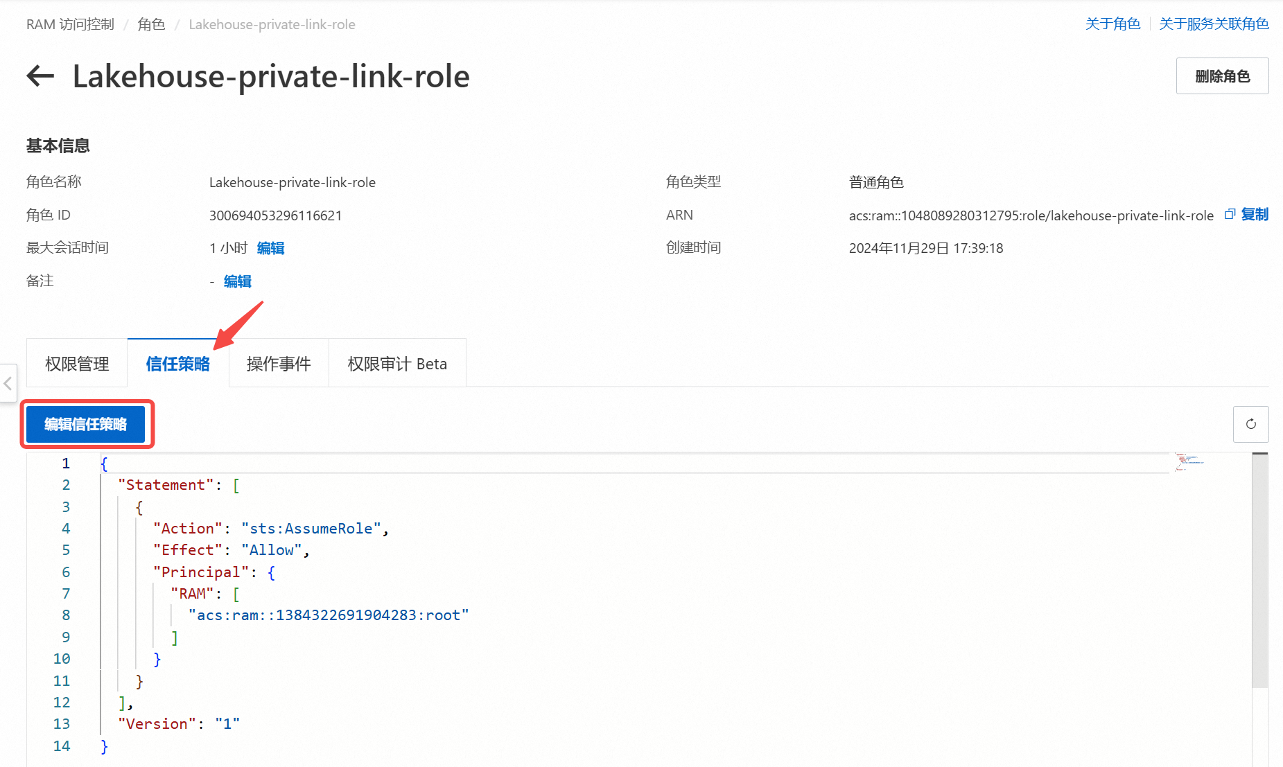 完成“确认新增授权”后,切换到“信任策略”页签,并点击“编辑信任策略”: