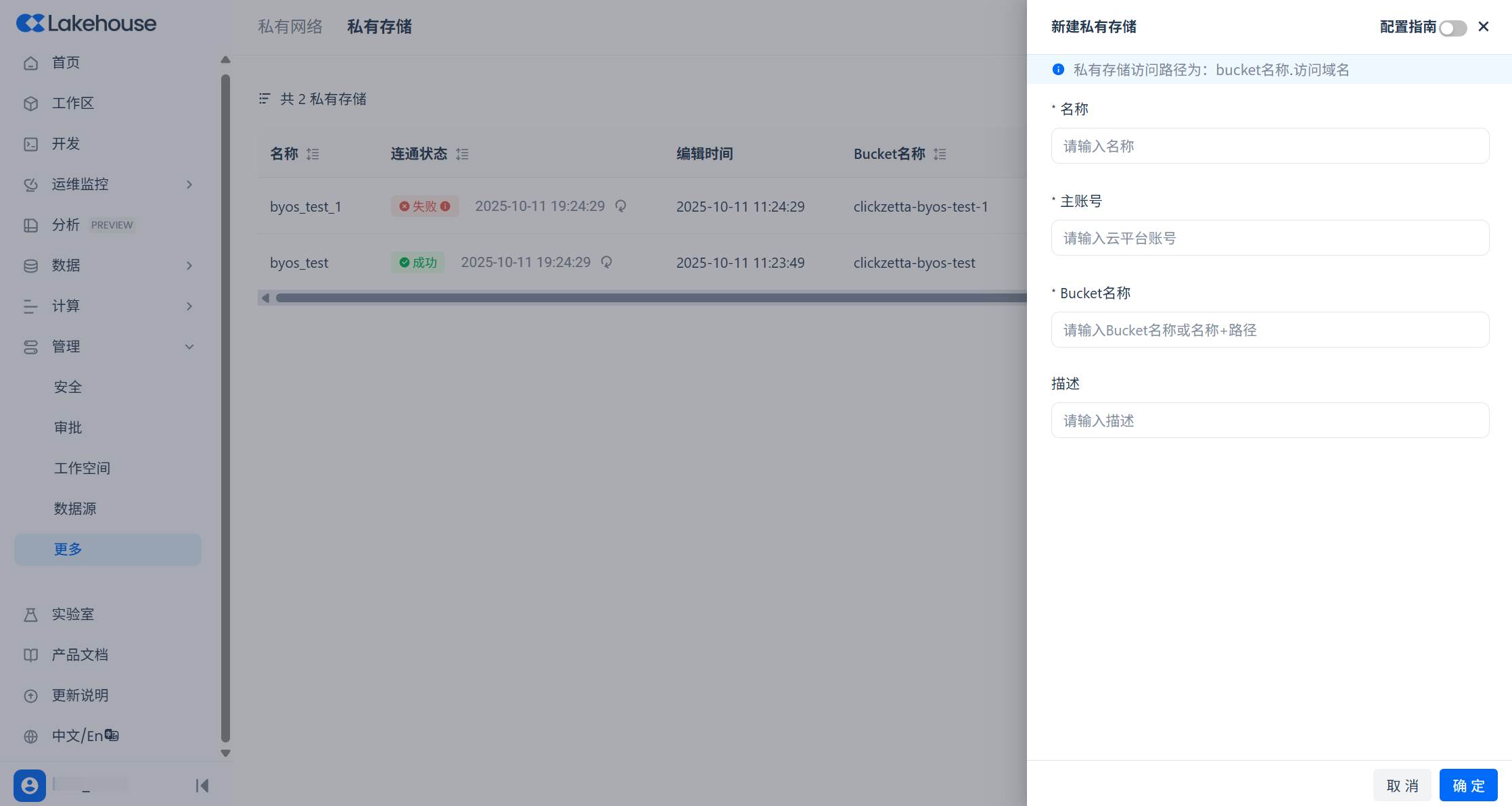 创建完成后,私有存储的默认连通状态为“失败”,需要点击私有存储右侧的“测试联通”按钮,测试私有存储的连通性。Lakehouse测试连通性时将进行的操作是:使用Lakehouse在云平台的账号调用同云平台同region的HeadBucket/GetBucketInfo等相似功能的接口,确认: