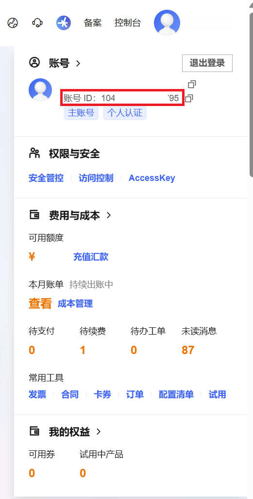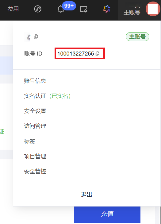 2)主账号【必填】:输入您在云平台中的账号ID,以便调用云平台接口时使用您授权的角色和Bucket。可在登录云平台账号后找到并复制。