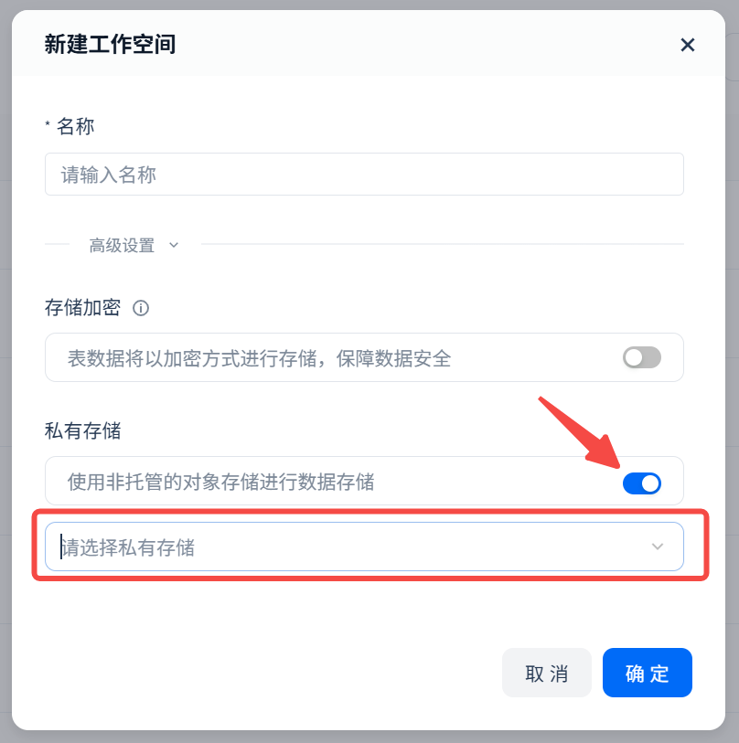 2)打开私有存储开关,选择已有的私有存储位置。一个私有存储位置可以关联多个工作空间。多个工作空间的数据会在该存储桶(bucket)下的子路径中区分开,不会互相影响。
