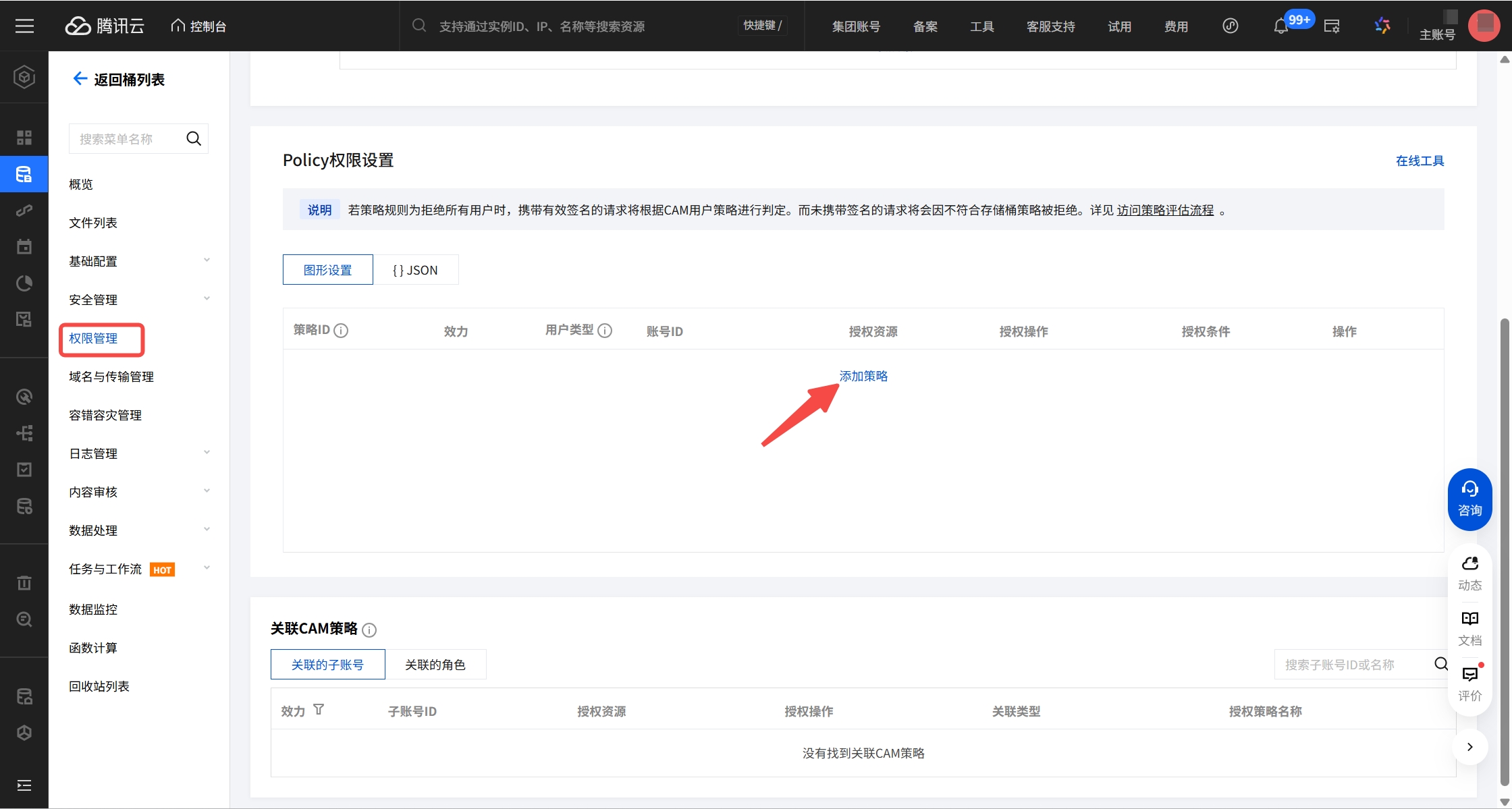 - 在“Policy权限设置”栏点击"添加策略"。