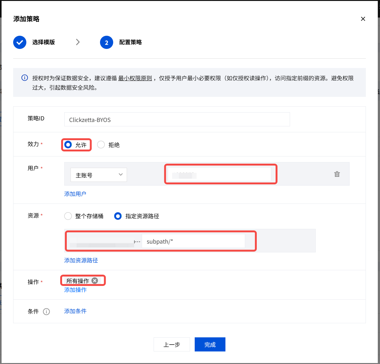 完成上述配置后,即可将您的私有存储路径和云平台主账号ID用于私有存储的新建中。