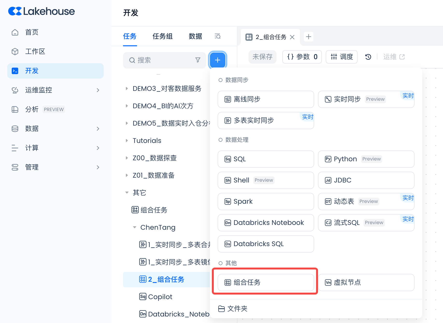 任务开发:任务Tab → 新建任务 → 选择“组合任务”