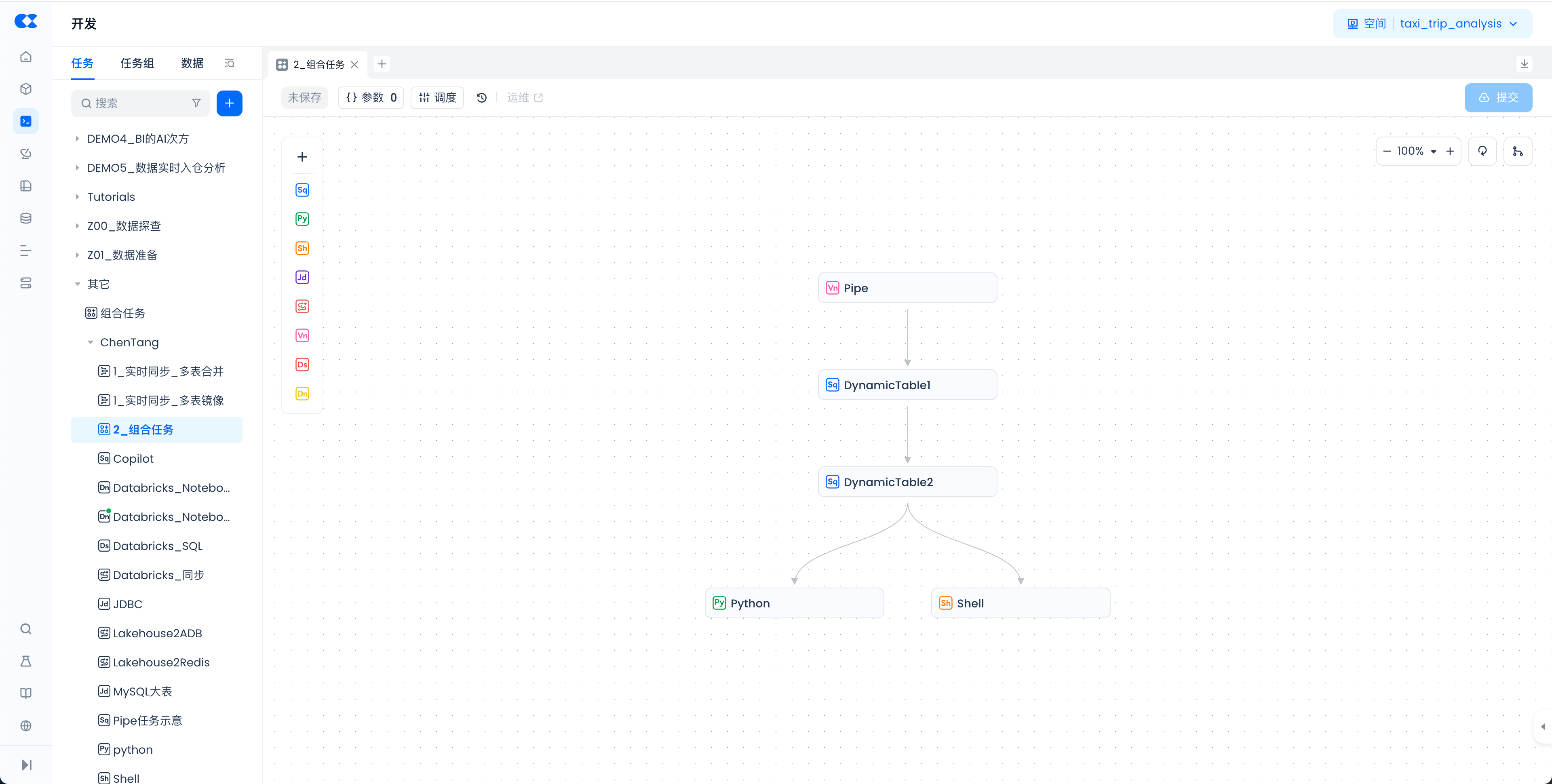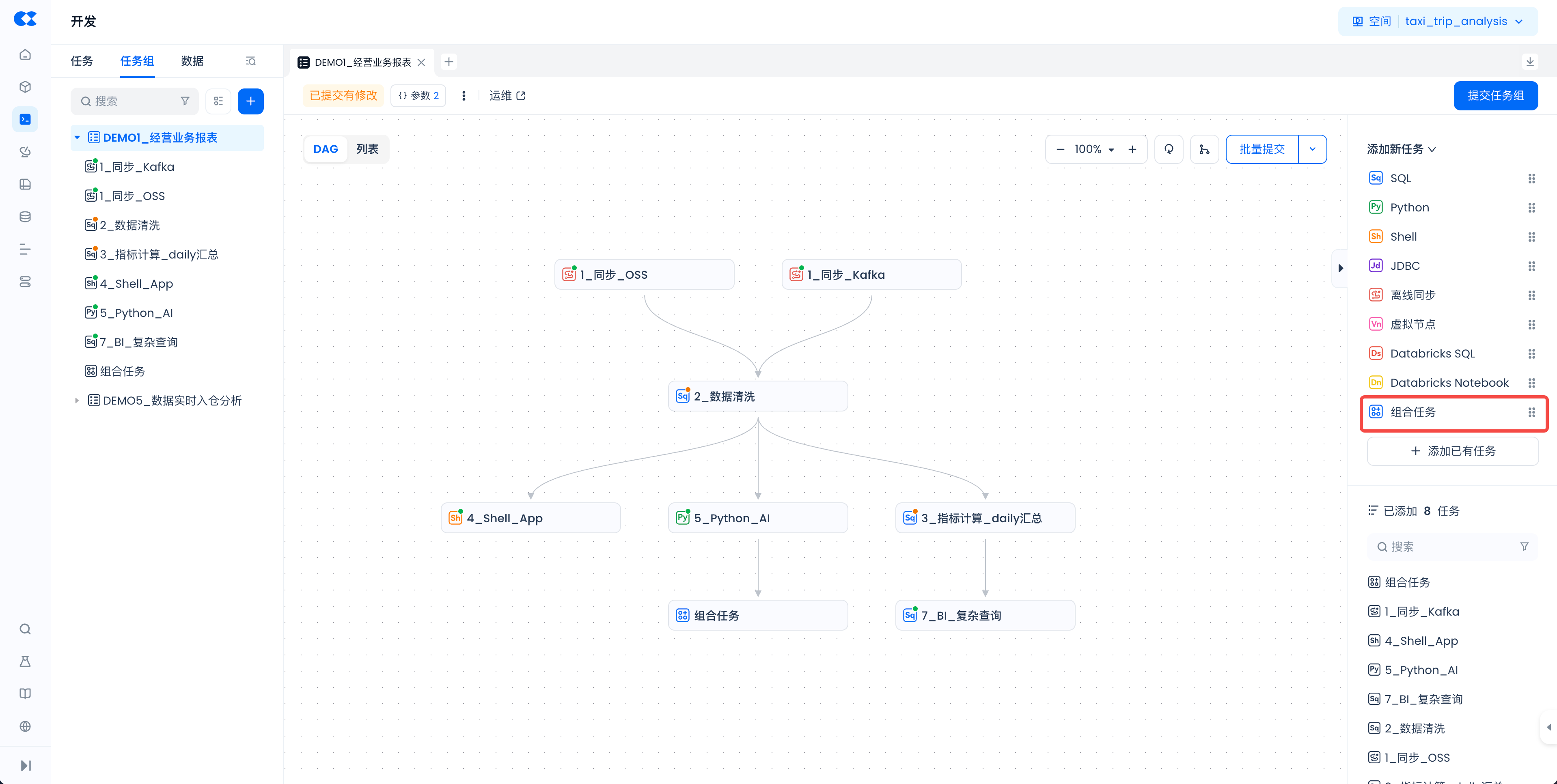- 从外部看,组合任务是一个整体,但内部会包含一到多个子任务节点(这些子任务可以是 SQL 任务、离线同步任务等各种周期调度任务)。