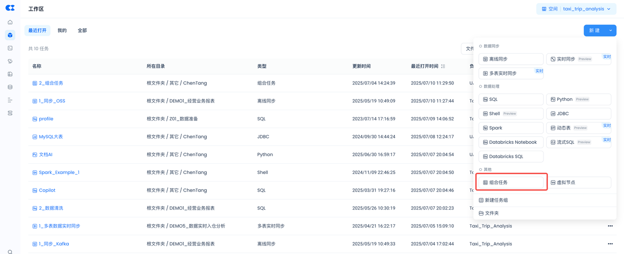 工作区:顶部导航栏 → 新建任务 → 选择“组合任务”。