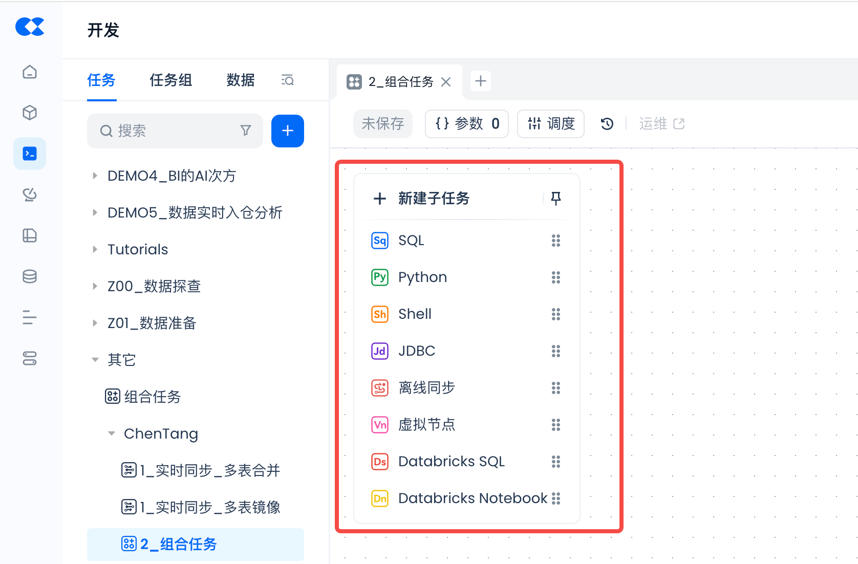 - 类型限制:组合任务的子任务,仅支持周期任务(离线同步、SQL等),实时任务(多表实时同步、Continious Job等)不可添加。