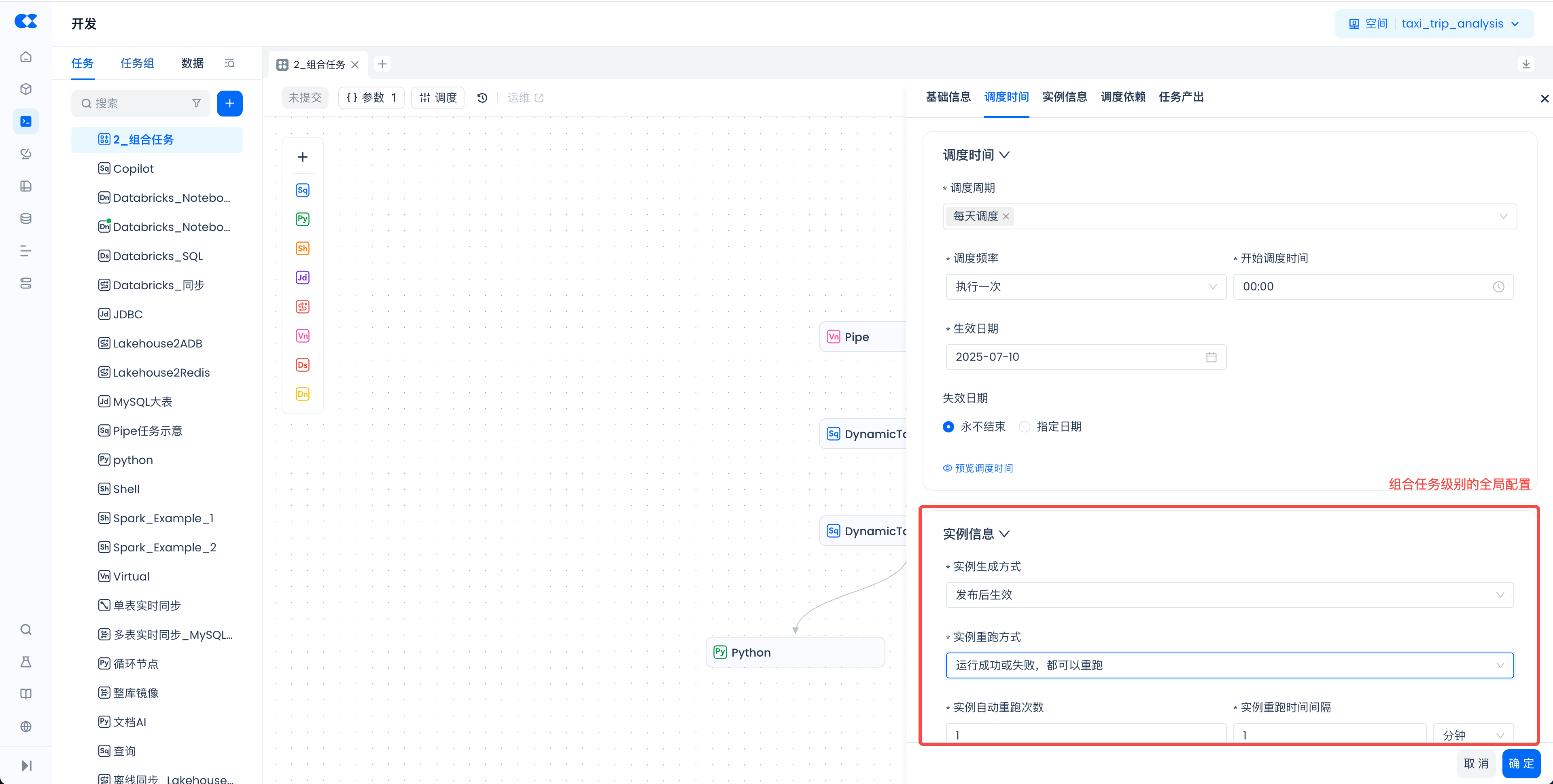 | 补数据 | 选择时间范围 → 组合任务整体按调度规则生成补数实例(包含所有子任务实例) |