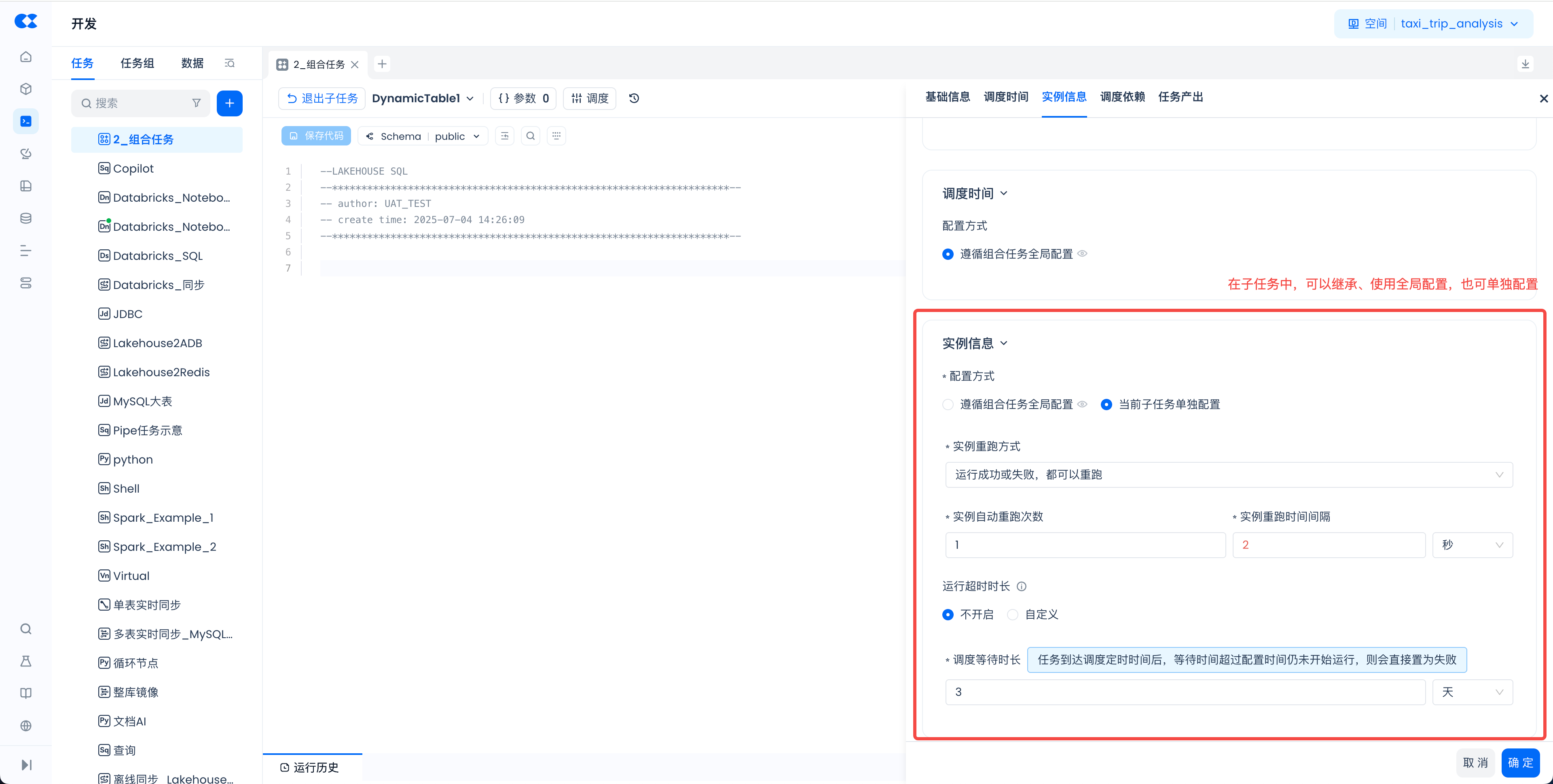 | 实例重跑 | 全局设置(重跑次数、间隔),子任务默认继承 | 可选覆盖全局设置(仅支持SQL等特定任务类型) |
