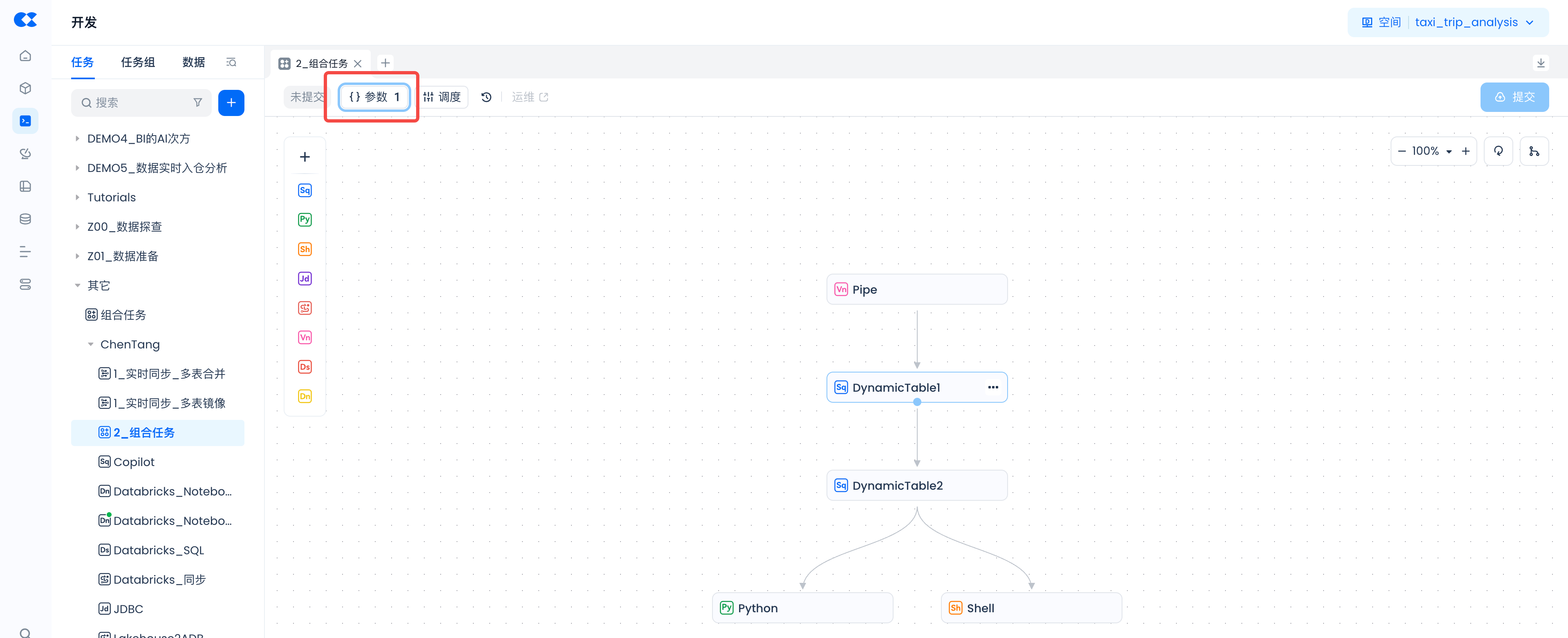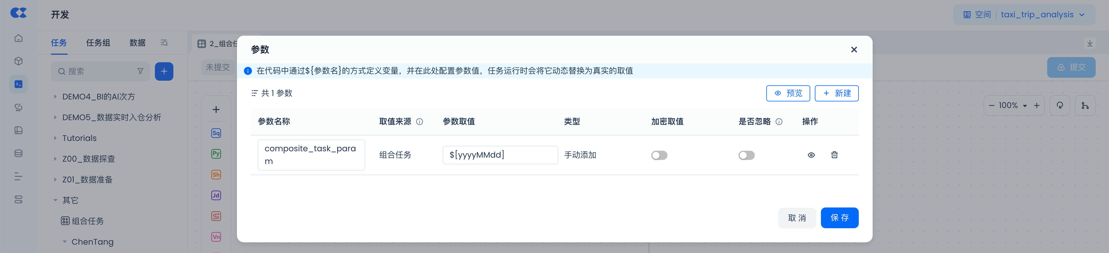 - 参数作用域:组合任务参数仅内部可见,不能被其他组合任务使用。跨组合任务共享参数,需通过任务组参数等来承接。