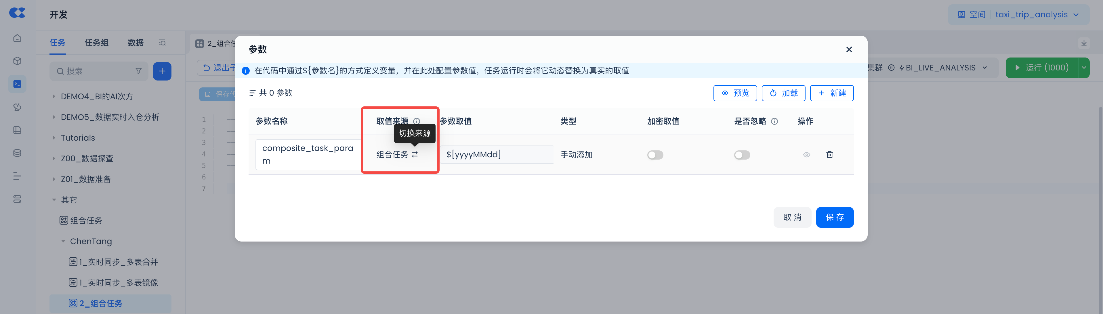 在子任务的参数配置中,如果参数名称和组合任务上定义的参数名称相同,在参数设定的地方,会自动识别并提示选择参数的取值来源。如果要使用组合任务全局定义的参数,取值来源这里选择“组合任务”,否则可以选择“任务”。