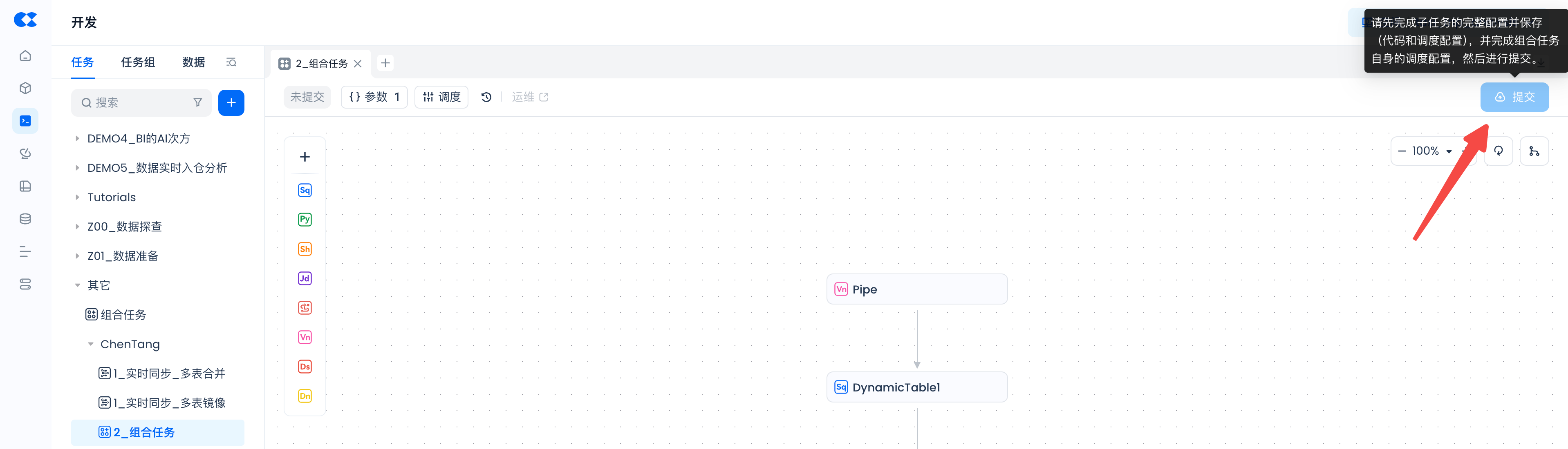 - 组合任务当前不支持全局统一来保存子任务节点。请操作单个子任务,确保代码、调度配置等信息得到了保存。然后再提交组合任务。
