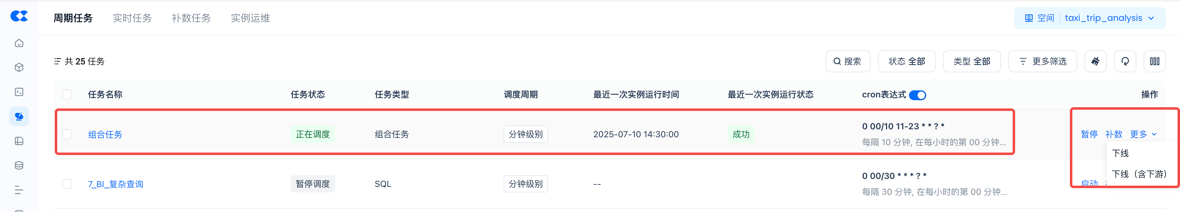 组合任务在运维中心里面,会跟其它周期任务一并在列表展示并支持类似的操作,诸如暂停、补数、下线等。
