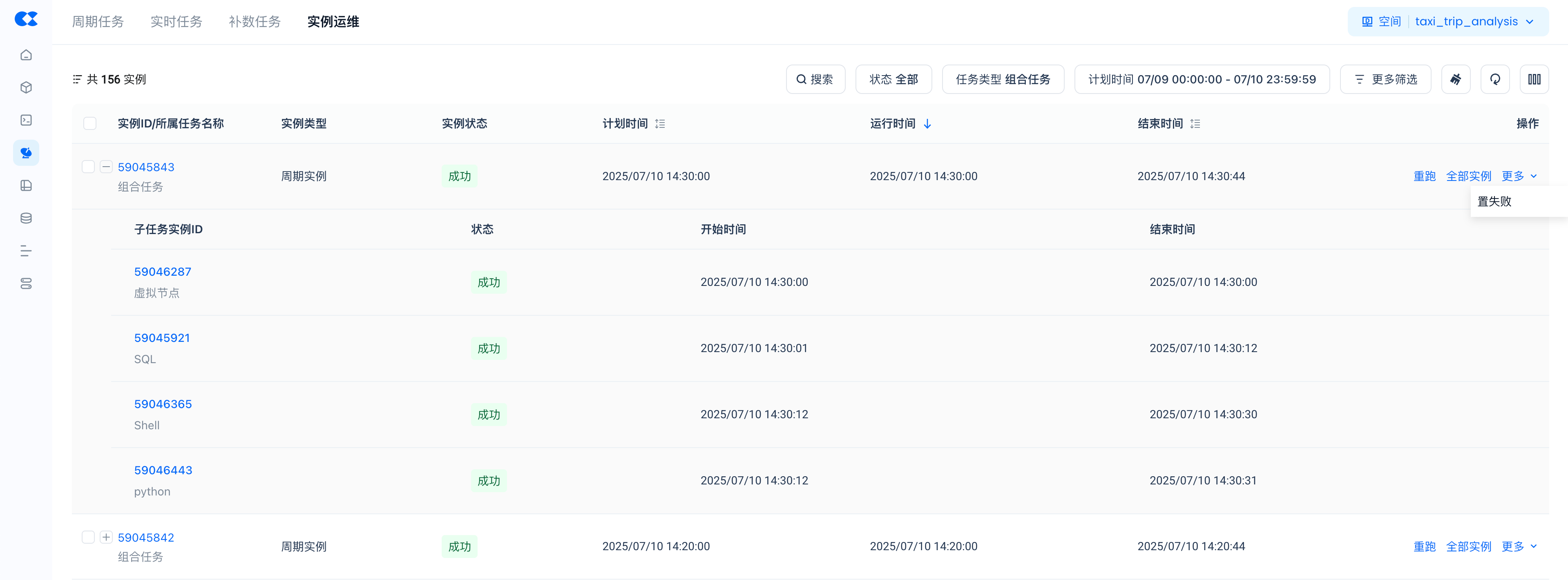 在实例运维Tab,可以查看到组合任务的实例,和其他周期任务实例并列,并支持重跑、置失败等操作,如下图所示:
