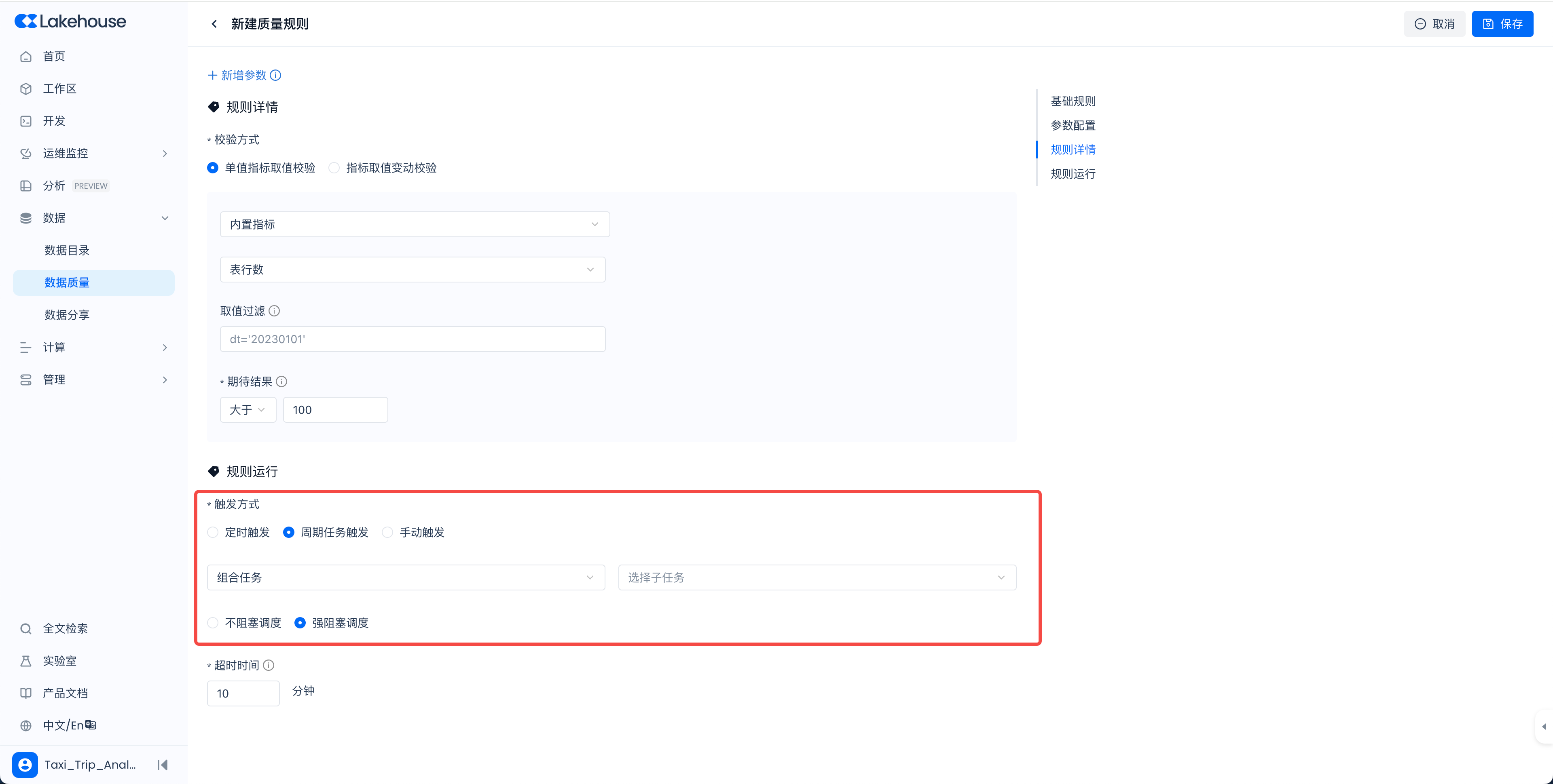 在配置数据质量规则时,规则运行触发方式中,可选择到组合任务来作为调度触发对象,如下图所示。可以选择具体的子任务来触发,如果“子任务”留空,会在组合任务整体运行完成后触发。