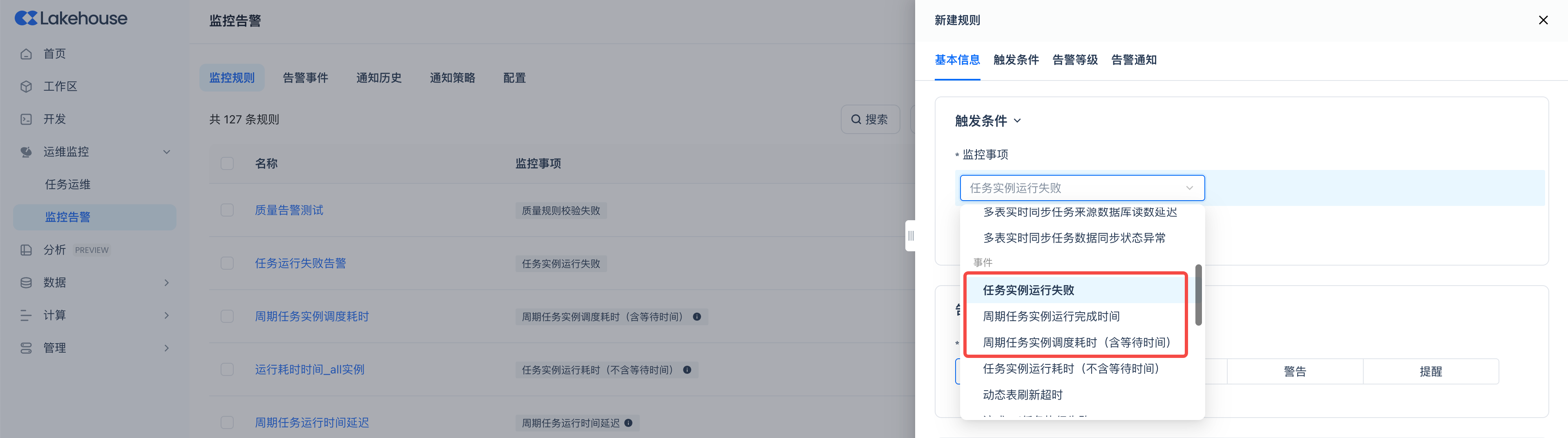 在监控告警中,组合任务会被归入周期调度任务大的分类。先前的”任务实例运行失败“、”周期任务实例完成时间“等监控项,对其也同样生效。可以类似普通SQL周期任务一样,来配置监控规则来对它的运行状态和耗时等进行监控。