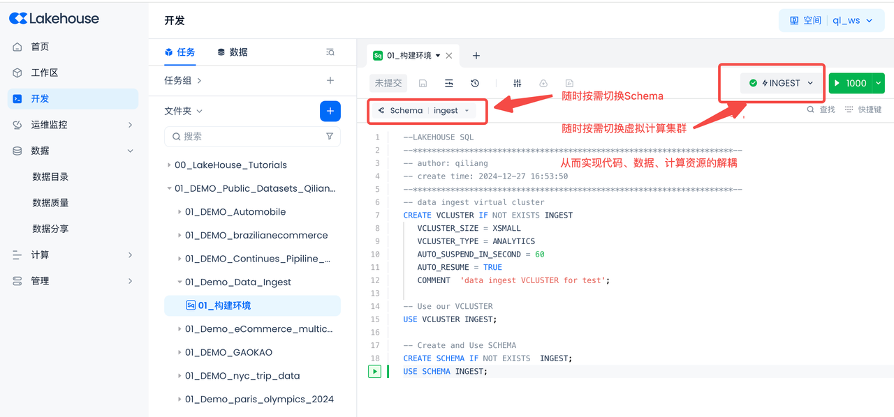 复制并粘贴以下SQL脚本以创建云器Lakehouse对象(虚拟计算集群、数据库Schema),然后单击工作表顶部的“运行”(你也可以直接下载本文件。)
