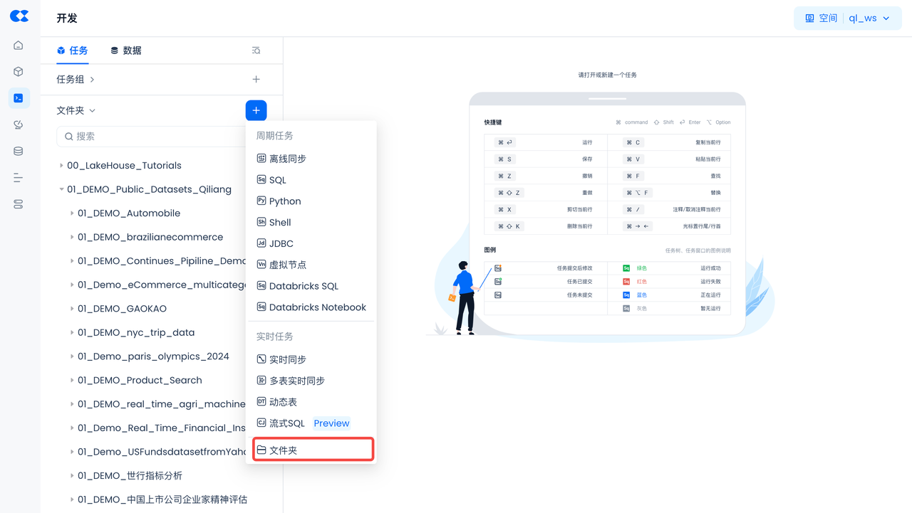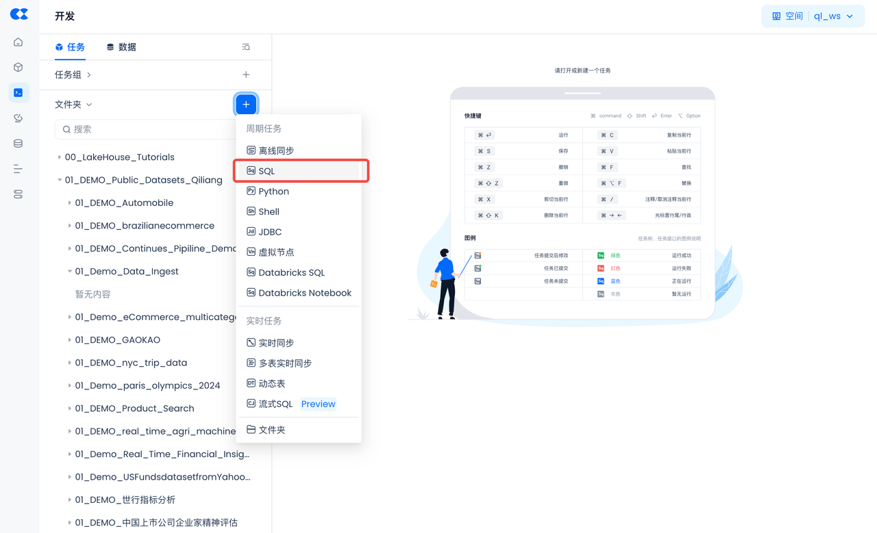 创建第一个任务,类型选择SQL。工作目录任务名:01_构建环境