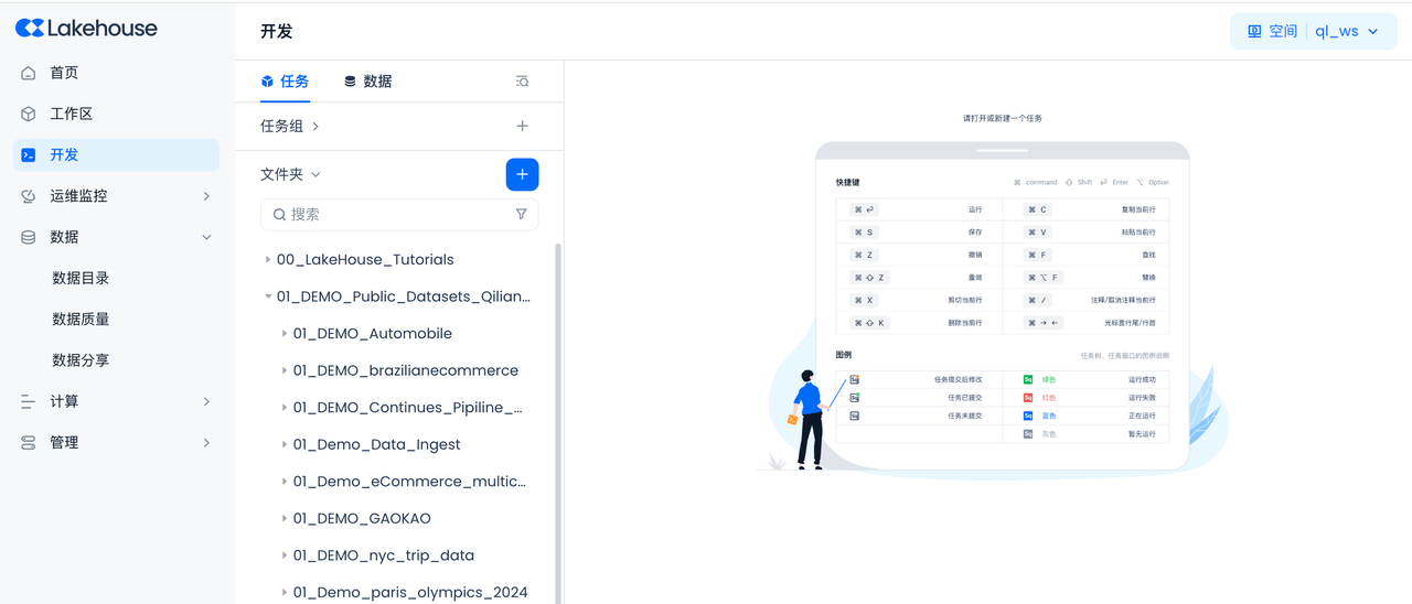 您将使用云器Lakehouse Studio 基于WEB界面操作来执行如下操作。