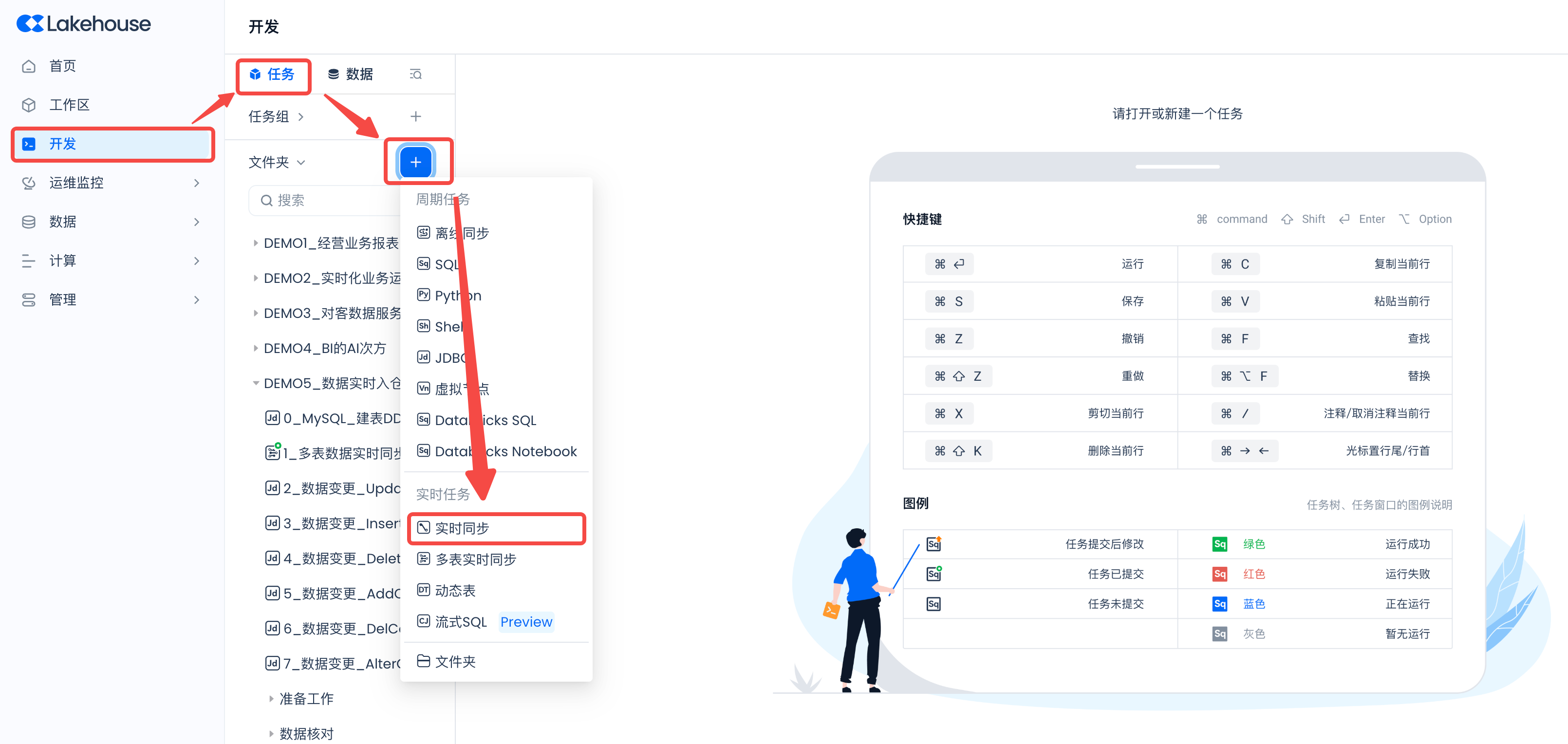 导航到开发->任务,点击“+”,选择“实时同步”,新建一个“实时同步”作业。
