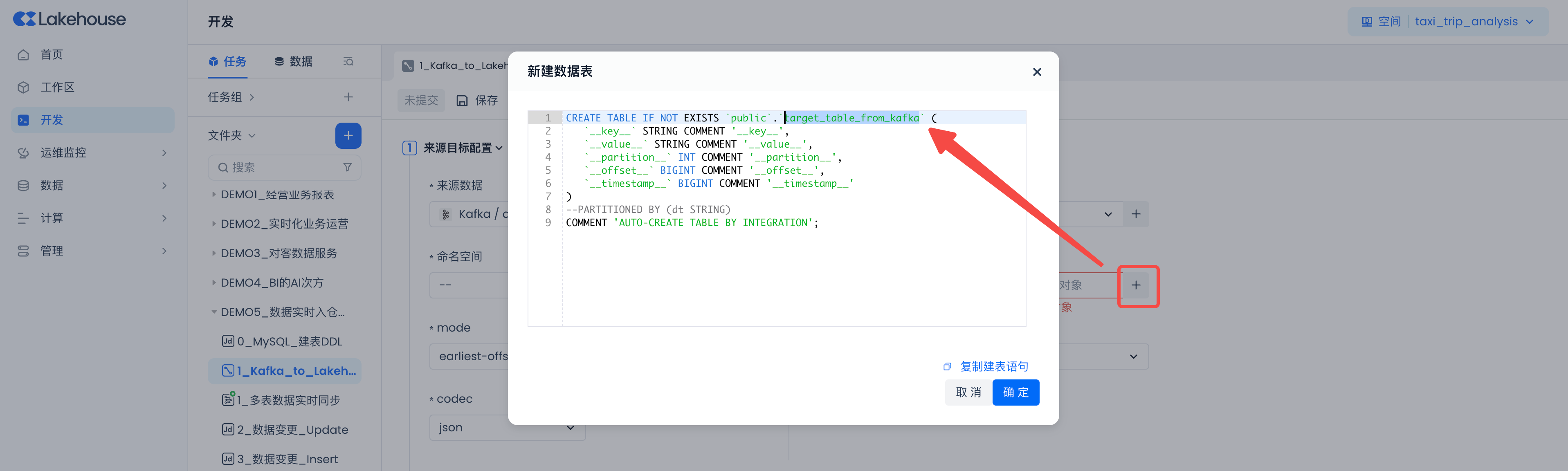 在“新建数据表”SQL代码里,将表名改为“target_table_from_kafka”。