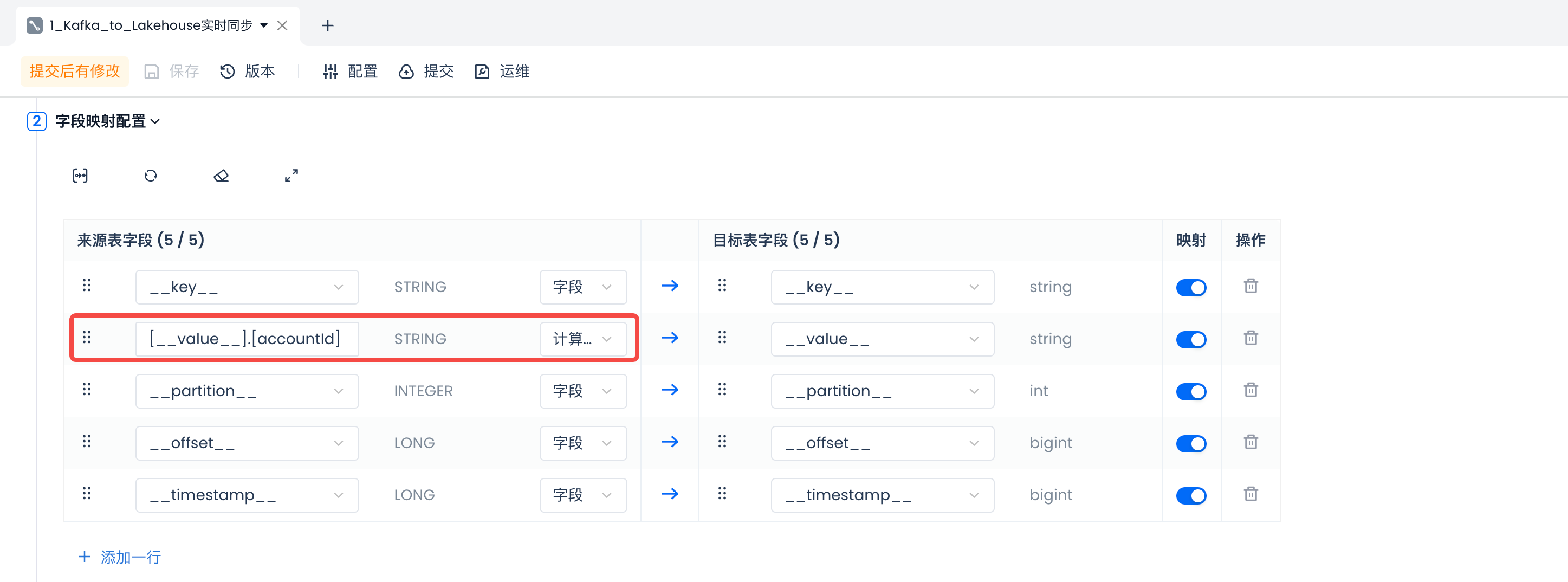 在“字段映射配置”区域,会默认使用Kafka Topic内置字段做数据字段映射。如果Topic内的消息格式为JSON,您还可以使用新增计算列方式,通过JSONPath规则解析value字段中的内容,比如通过下图所示的 [__value__].[accountId] 来提取源端topic中的 __value__ 里面的accountId字段、写入到目标端 __value__ 字段中。