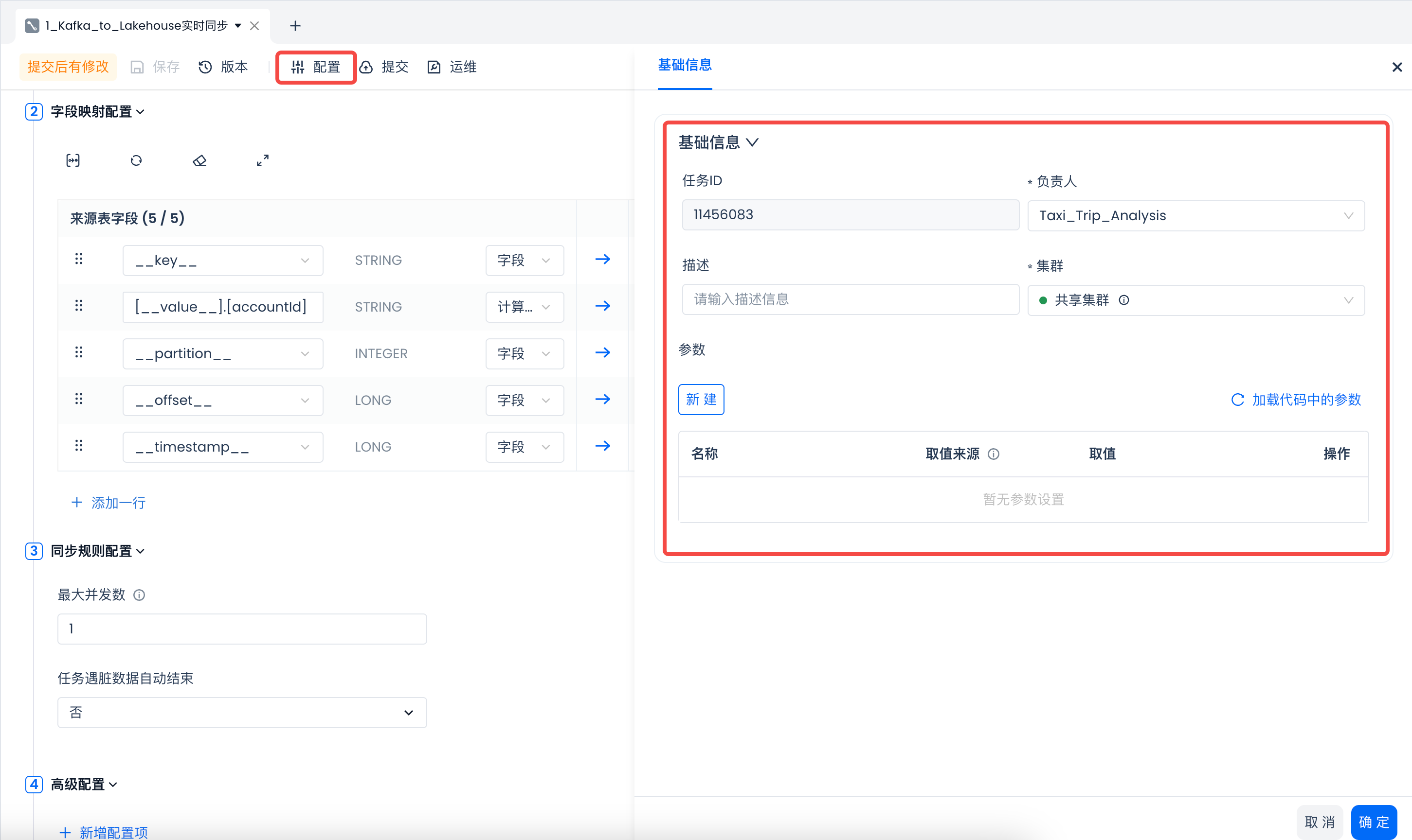 检查字段映射符合预期后,在配置中设定“集群”等必填信息,点击“确定”,然后点击“保存”来保存任务配置。