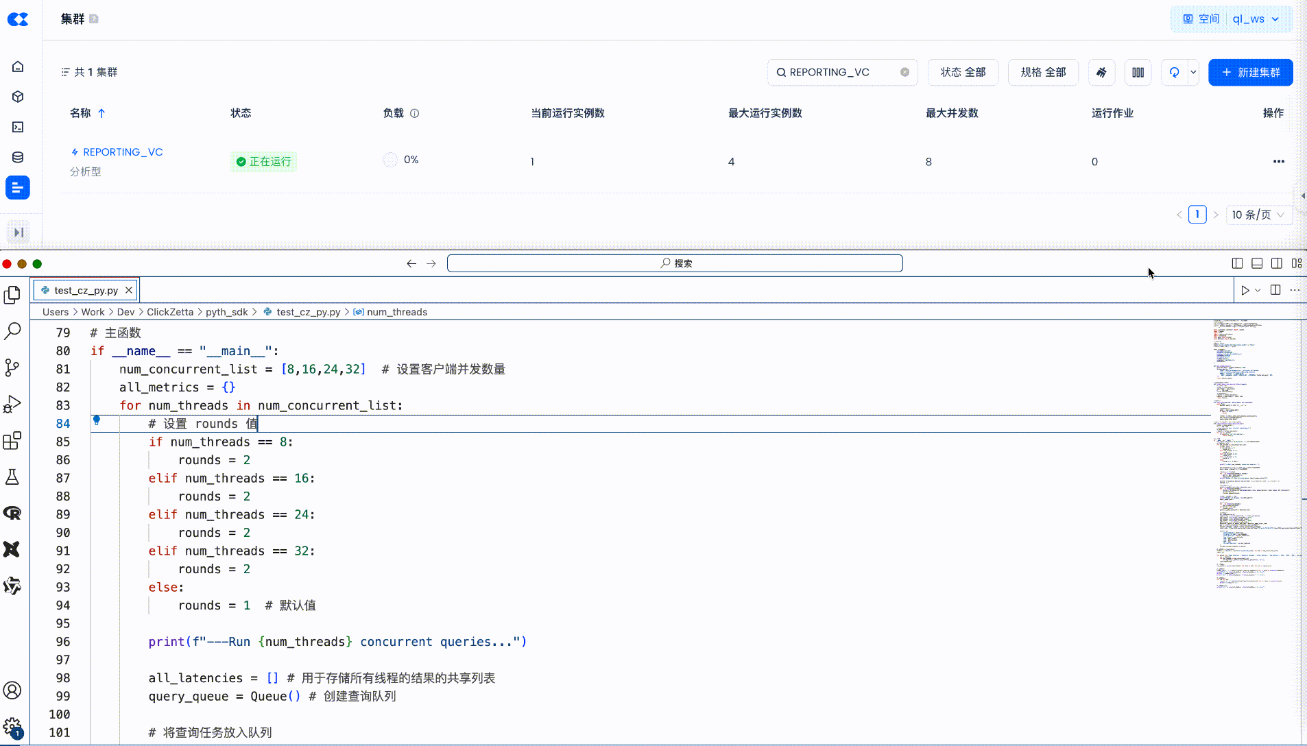 - 发起查询:使用 Studio Web 环境创建 Python 任务对Lakehouse使用不同并发度进行连续查询,观察Python任务的执行日志结果了解集群在不同并发请求下的快速扩缩容能力。