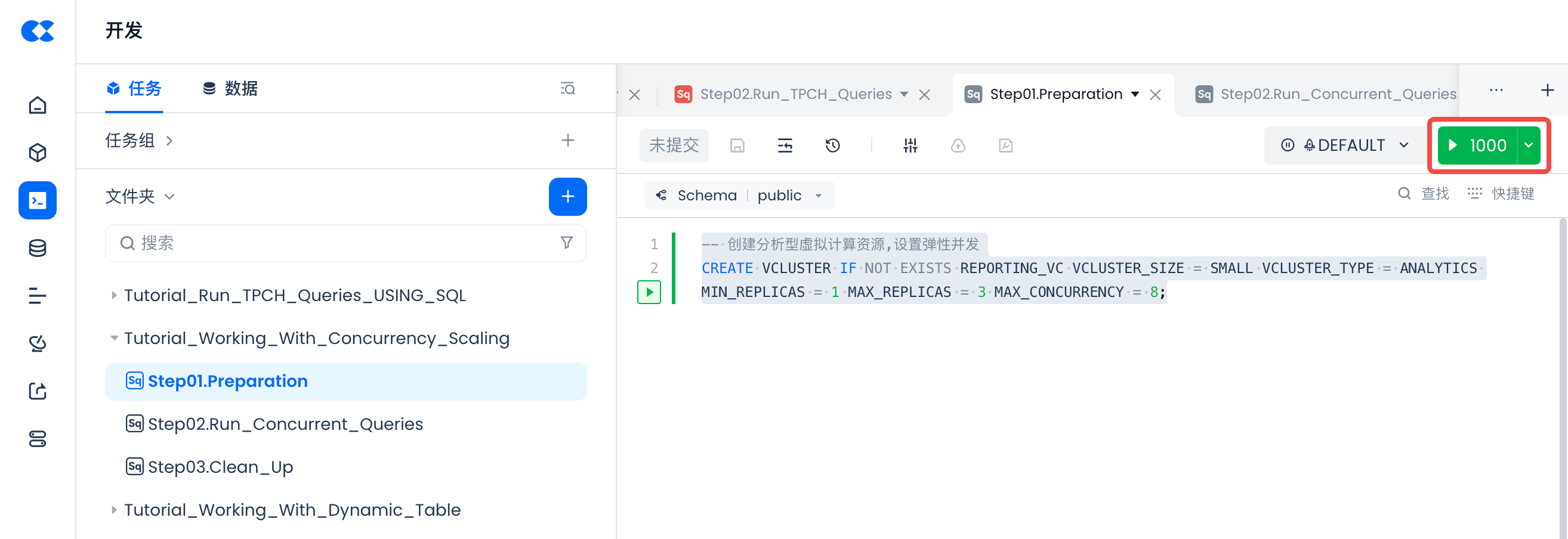 打开控制台Tutorial 页面中的"Lakehouse教程",选择"通过横向弹性扩容支持多并发查询"课程。根据页面提示导入本次课程需要的脚本文件。