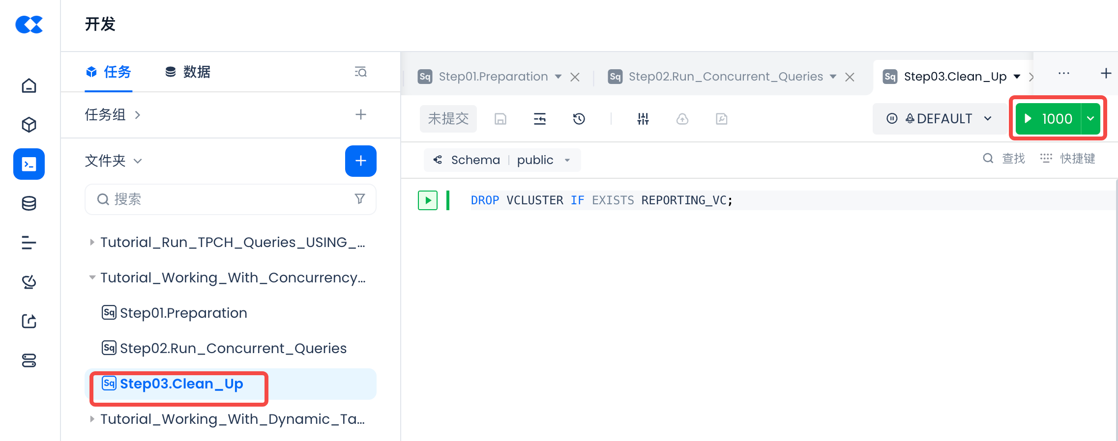 打开”开发”模块 [Tutorial_Working_With_Concurrency_Scaling->Step03.Clean_Up] SQL脚本文件,执行脚本即可删除本教程测试集群。