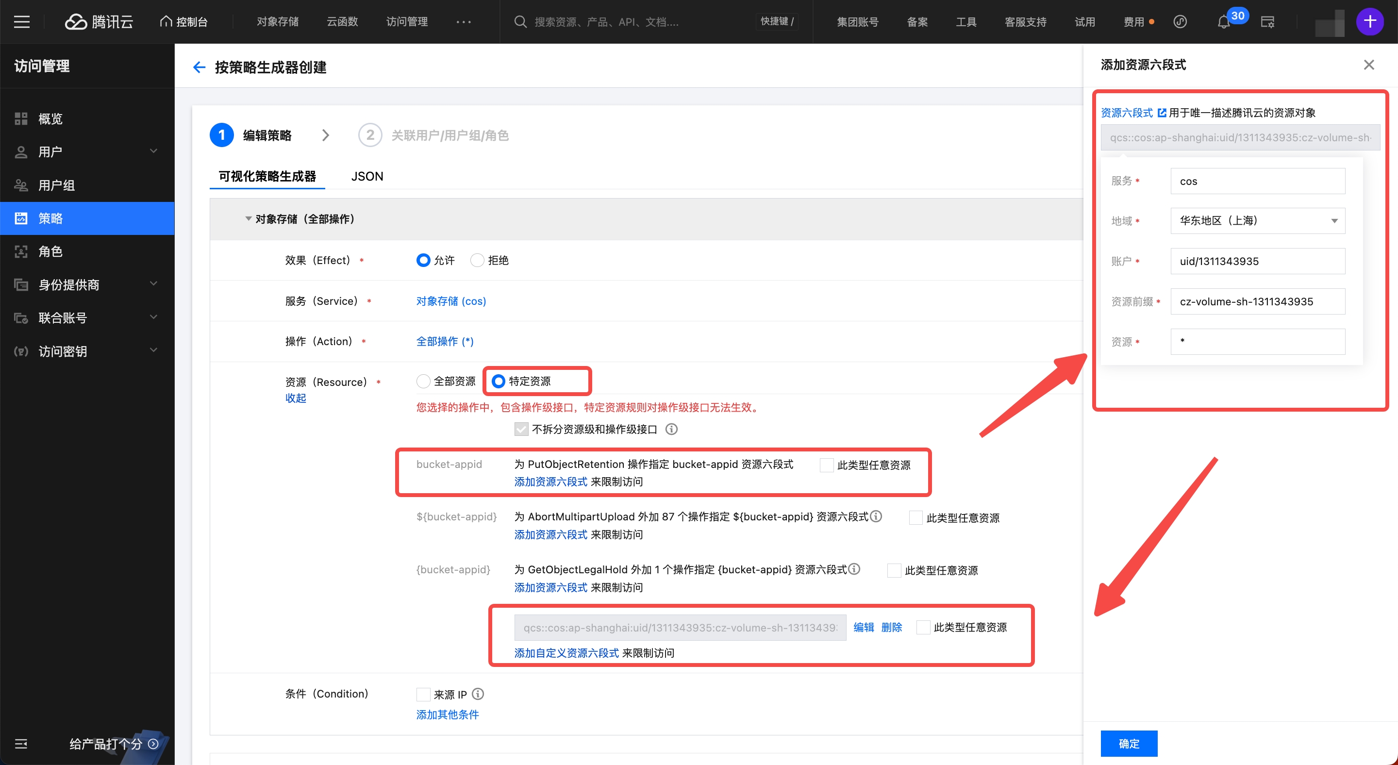 - 在可视化策略生成器页签中:服务(Service): 选择 对象存储(cos);操作(Action):选择全部操作(可根据实际需要的操作,做更细粒度的选择);资源(Resource):根据需要选择全部资源或者特定资源。本示例中选择特定资源,为上海区的