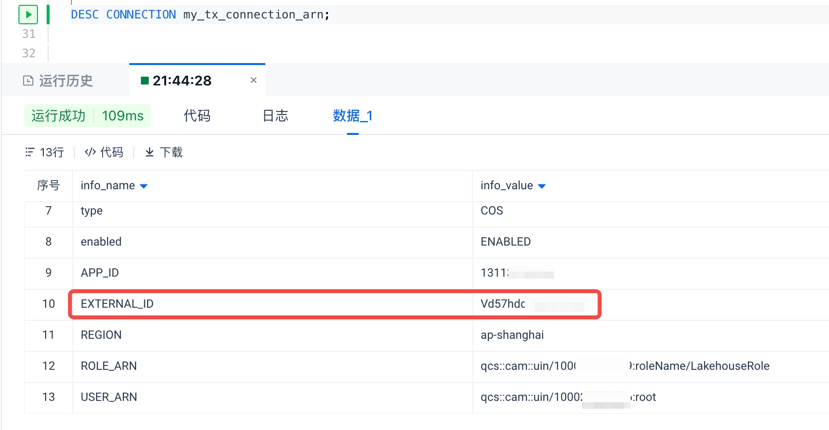- 在创建存储连接的过程中,Lakehouse 会生成此EXTERNAL ID,可以将此EXTERNAL ID 配置到 COS 账号的角色校验中实现访问控制: