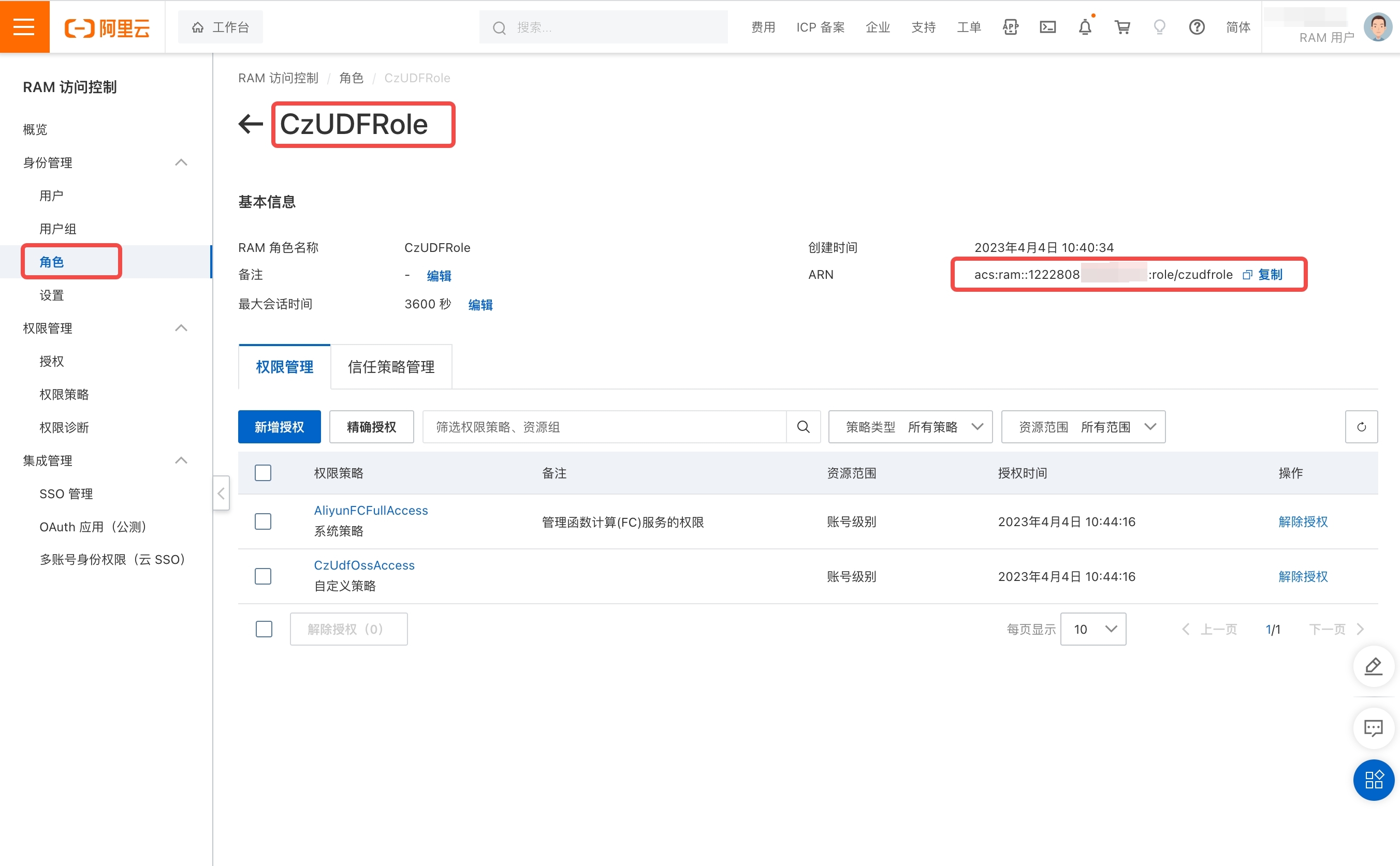 步骤5: 创建完成之后,点击为角色授权: 在自定义策略中,将刚创建的策略(CzUdfOssAccess)授权给该角色。在角色 CzUDFRole 详情页中,获取该角色的 RoleARN 信息: