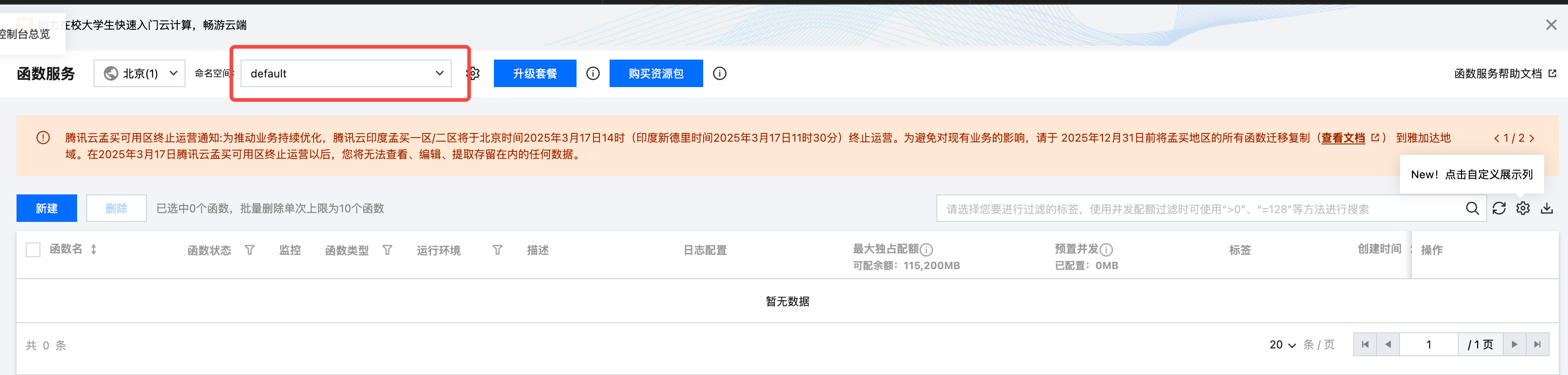 其中,NAMESPACE:在腾讯云使用必须提供。如果是其他云服务则可以不填写或者直接填写'default'