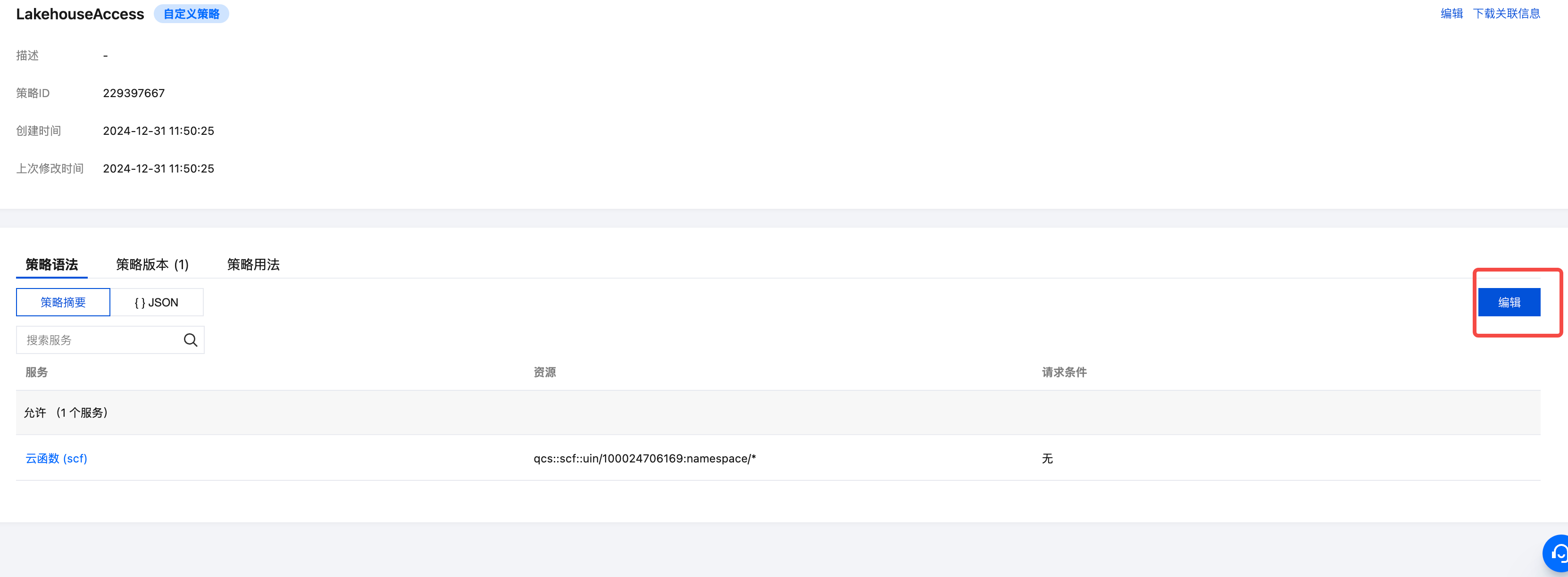 - 进入访问管理产品控制台。找到刚刚新建的“LakehouseAccess”策略。选择编辑