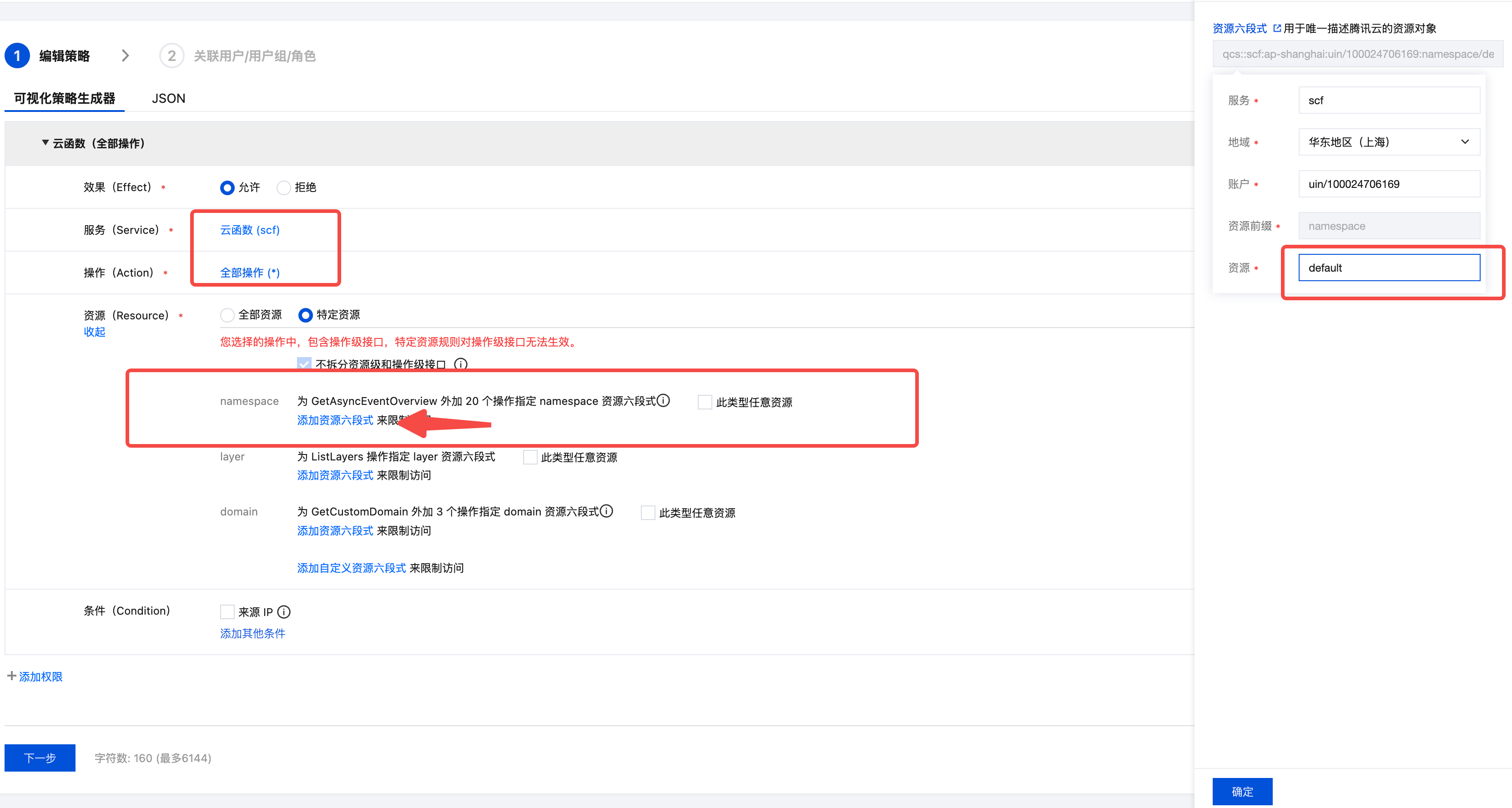 - 在可视化策略生成器页签中服务(Service): 选择云函数;操作(Action):选择全部操作(可根据实际需要的操作,做更细粒度的选择);资源(Resource):根据需要选择全部资源或者特定资源。本次案例选择为特定资源,使用 namespace 授权如下图,点击编辑按钮,选择步骤1中的开通region,资源可以是*也可以指定namespace,本次案例为中的命名空间:default。如图二中云函数红色标记的位置点击创建完成该策略