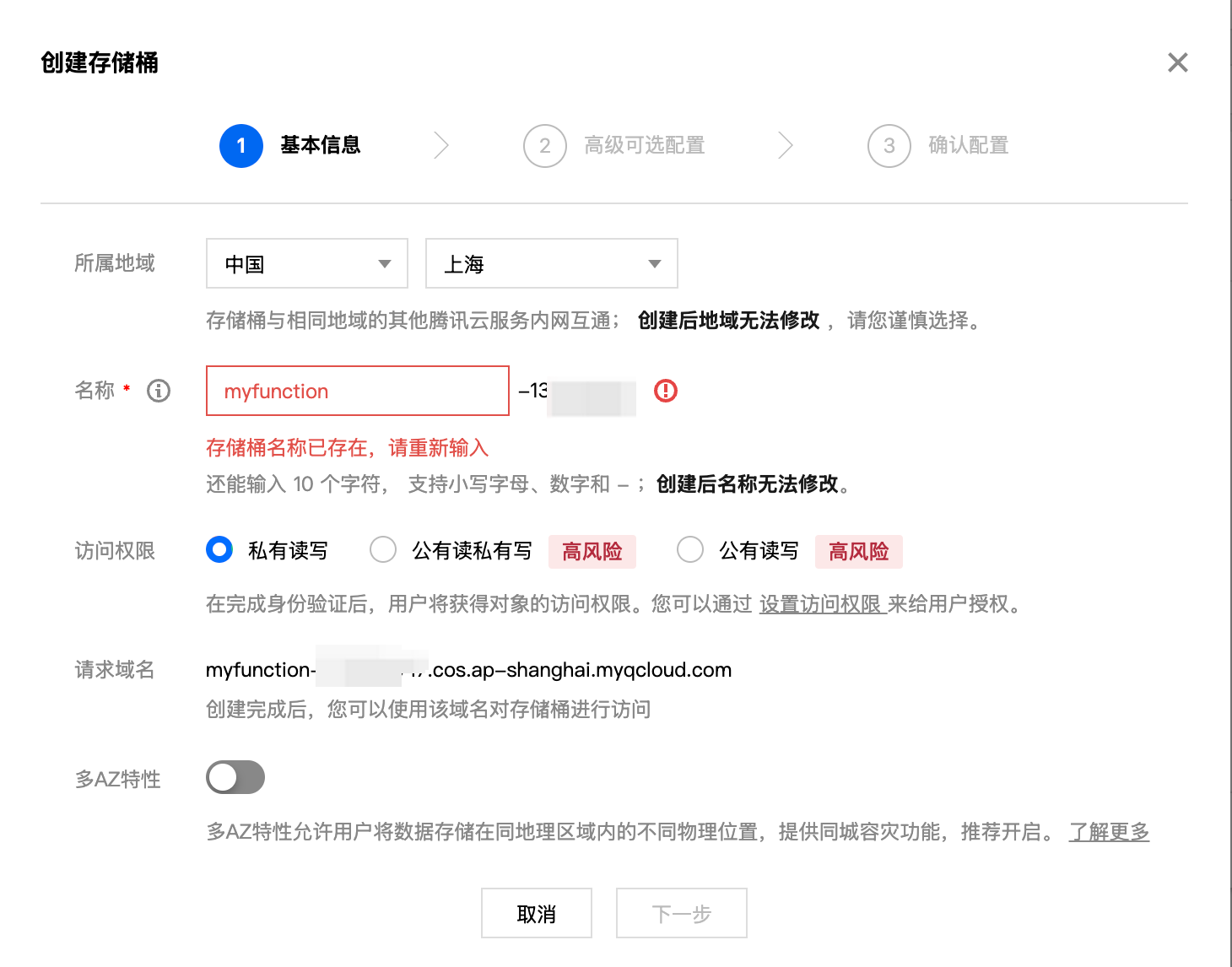 - 新建 bucket 用于存放函数代码 region 保持和云器 Lakehouse 开服区域一致。如下图新建的 bucket 为myfunction