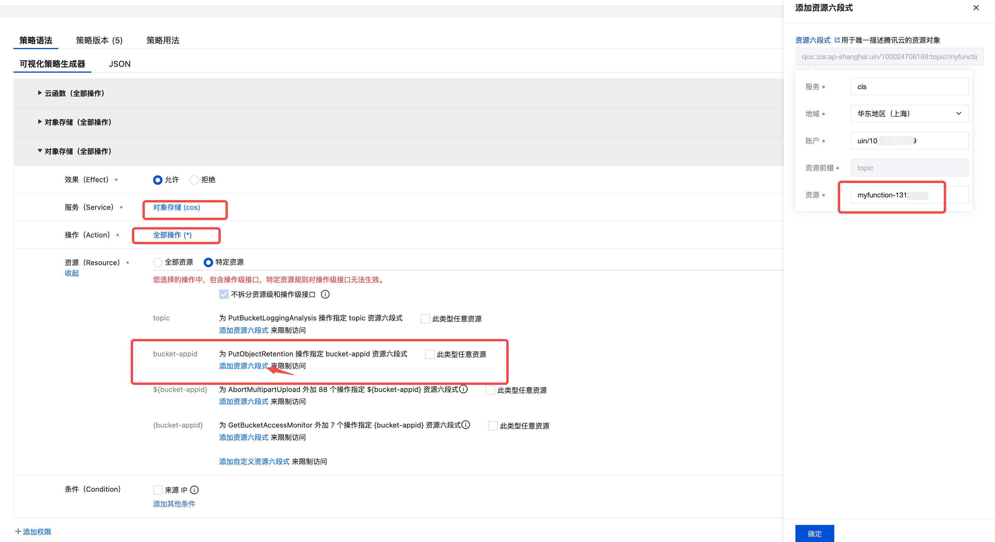 - 服务(Service): 选择 对象存储(cos);操作(Action):选择全部操作(可根据实际需要的操作,做更细粒度的选择);资源(Resource):根据需要选择全部资源或者特定资源。本示例中选择特定资源,为上海的