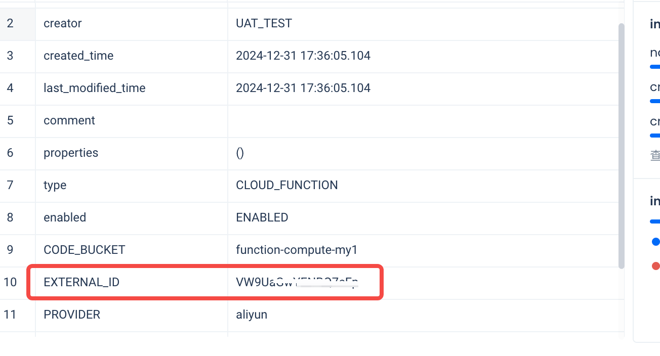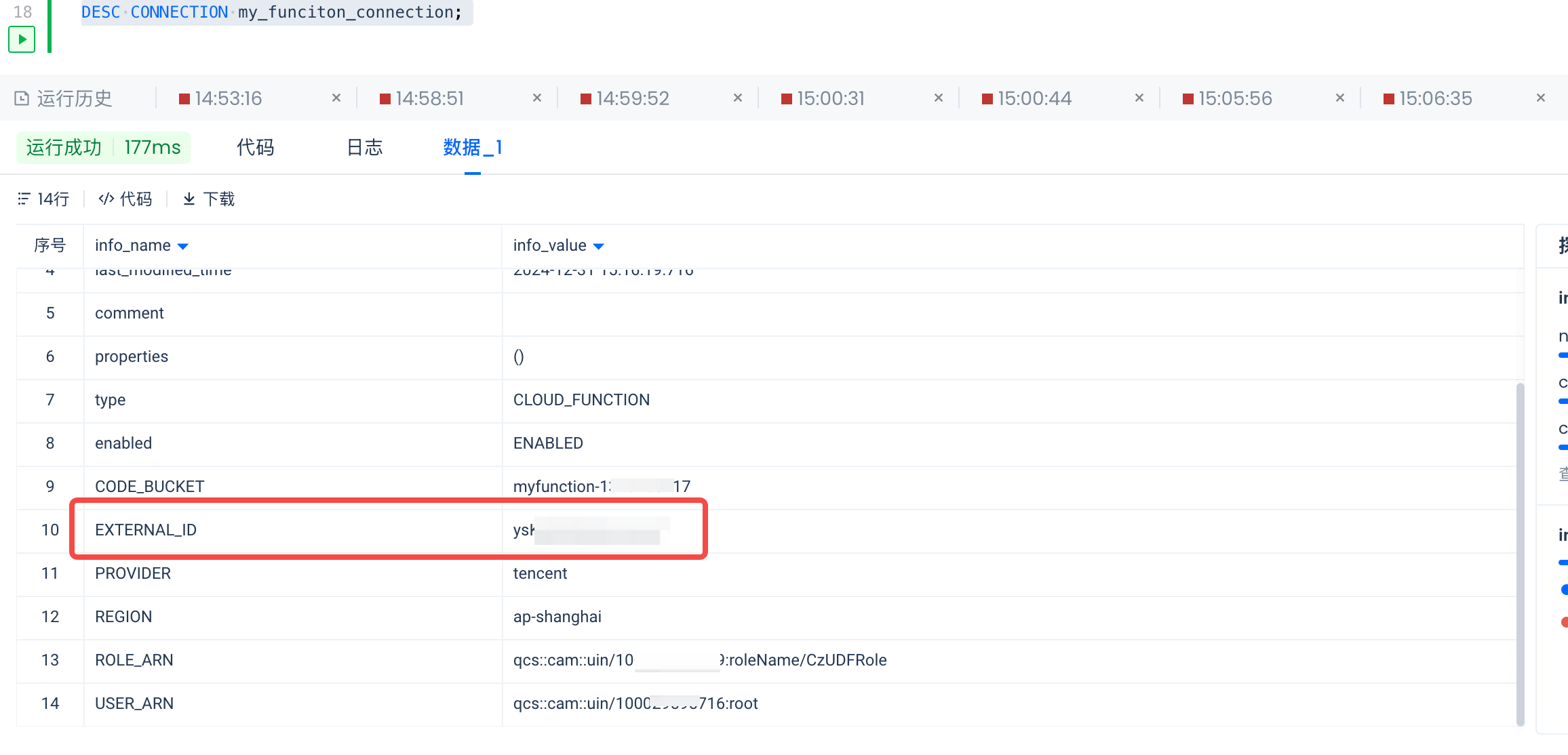 - 步骤7: desc connection 获取 external ID 信息:本实例中,external ID 为: