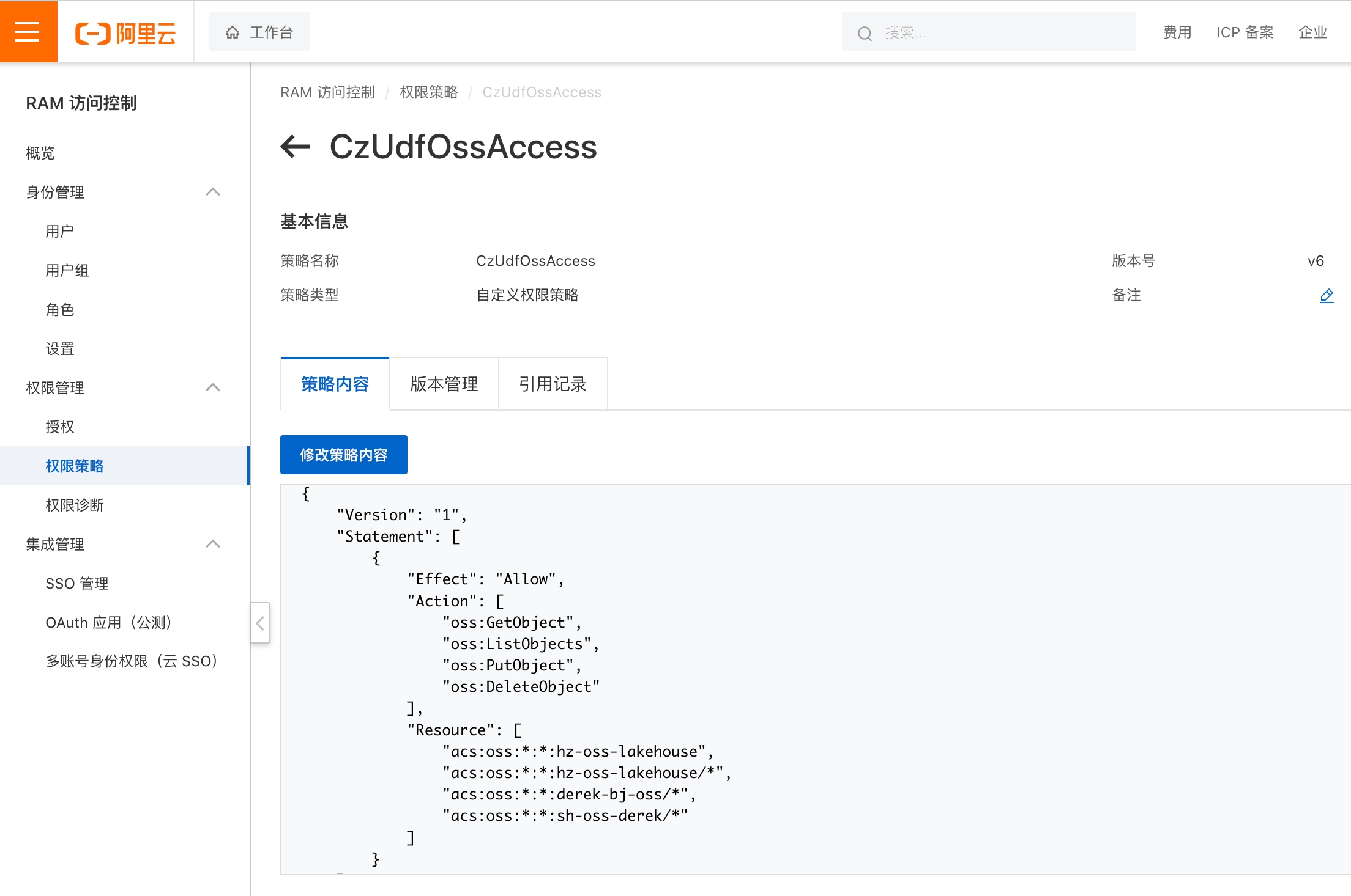 - 阿里云侧操作:在阿里云 RAM 控制台中创建权限策略 (CzUdfOssAccess ):注意:需要用户具有RAM权限