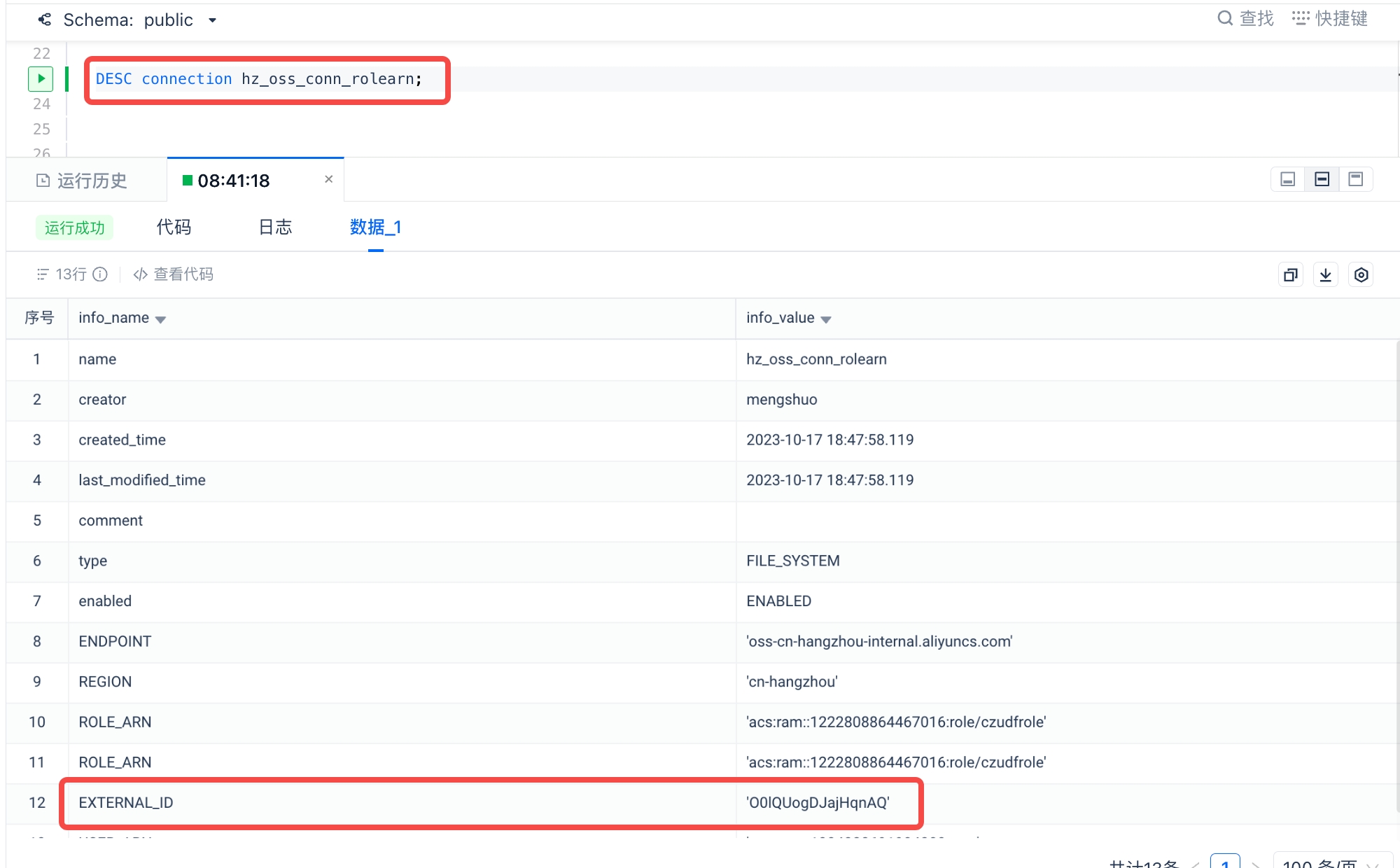 - 在创建存储连接的过程中,Lakehouse 会生成此EXTERNAL ID,可以将此EXTERNAL ID 配置到 STEP2创建的 AWS IAM 角色(