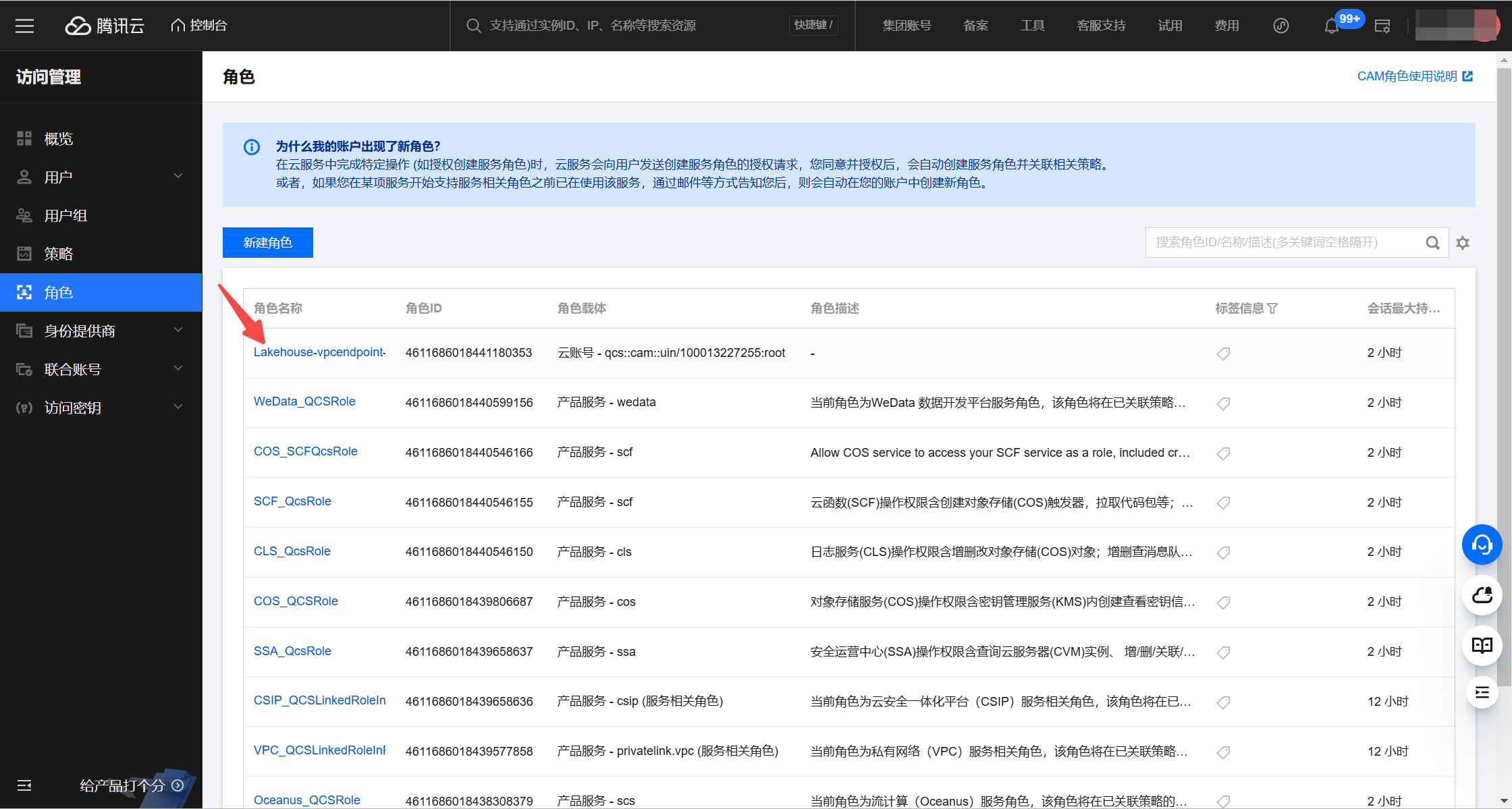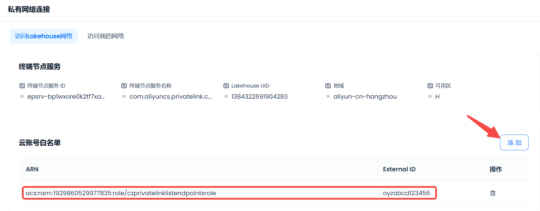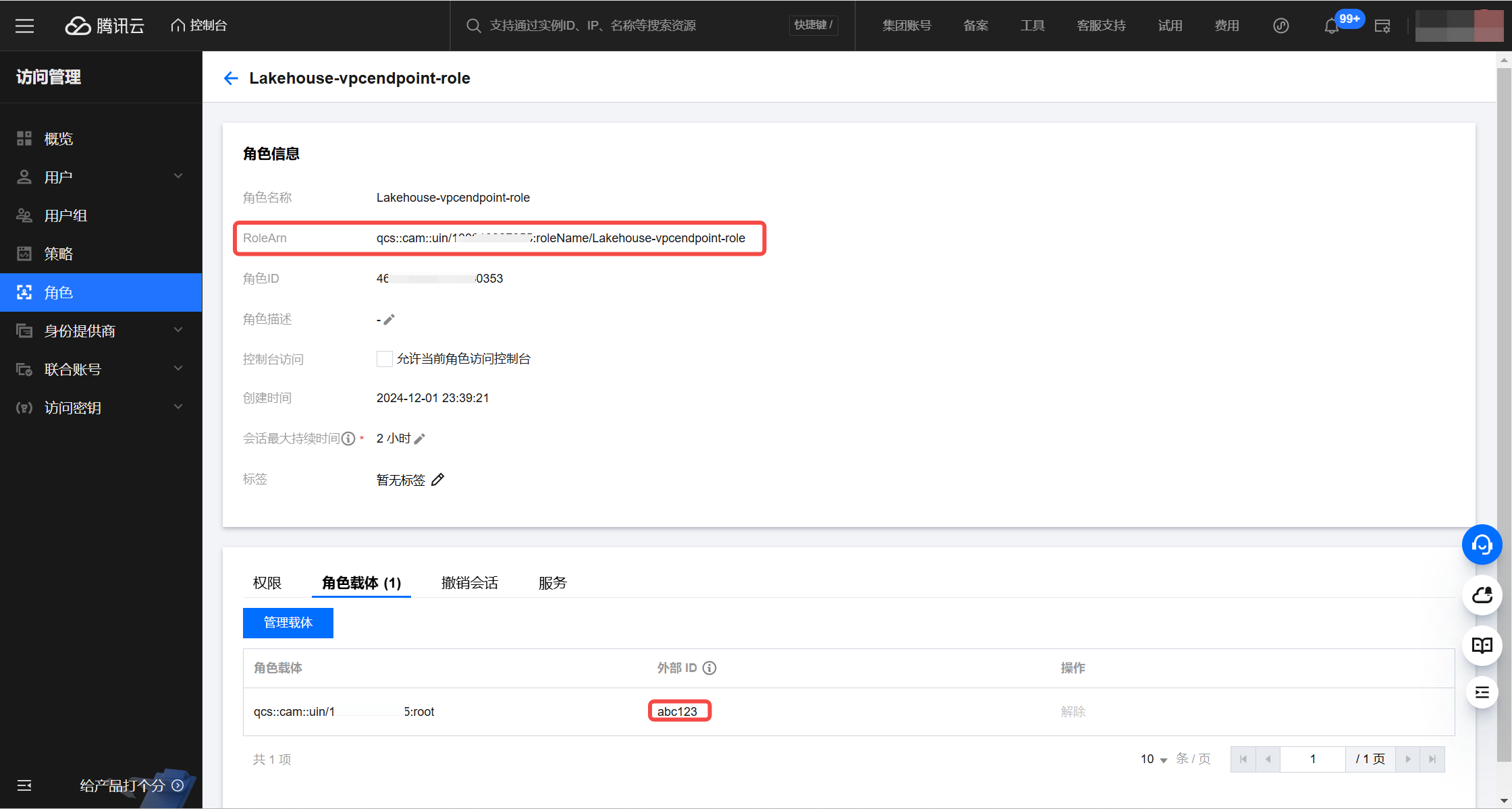 为保障Lakehouse能够正常读取您的终端节点状态,并增强获取您云服务平台内终端节点信息方式的安全性,请在云服务平台内创建独立的访问控制角色,并授权及添加external ID。