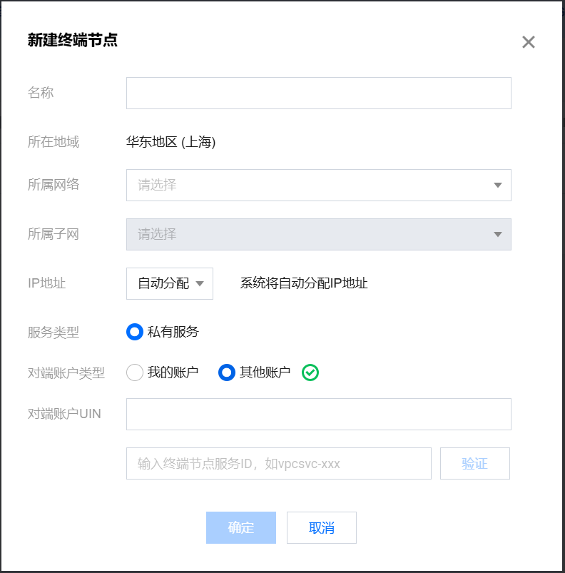2. 新建终端节点。在终端节点页面点击“新建”按钮,“对端账户类型”选择“其他账户”。然后在“对端账户UIN”和对端终端节点服务ID中,分别填入在Lakehouse页面复制的“Lakehouse UID”和“终端节点服务ID”。点击“确定”。