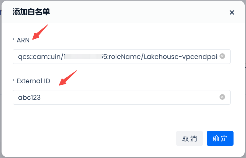 在腾讯云访问控制角色列表页面,单击希望添加其ARN的角色名称,并在角色详情中选择“角色载体”,分别复制该页面中的“RoleArn”和“外部ID”两个内容,回到云器Lakehouse页面在添加白名单弹窗中,分别将上述两项内容复制进对应的选项中。