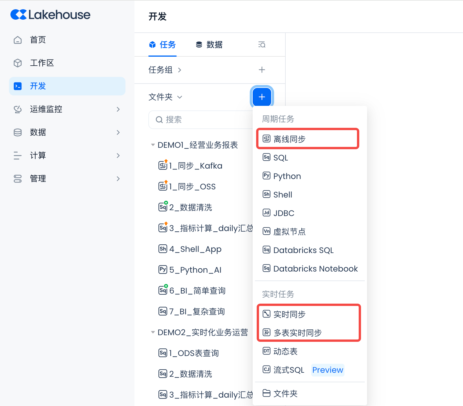 Lakehouse Studio中目前支持离线周期同步和实时同步两大类同步任务类型。在“开发->任务”中的新建按钮,按需选择合适任务类型使用。