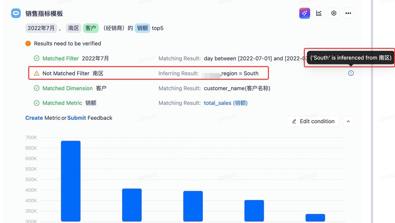 - 例如问题:2022年7月南区的销售额是多少? 实际表中 region 字段存储的值为 South,如果不添加索引。用 region = '南区' 为条件无法搜出任何值。如果添加索引,系统会将“南区”与原值“South”做相似度匹配,并给出推测提示:
