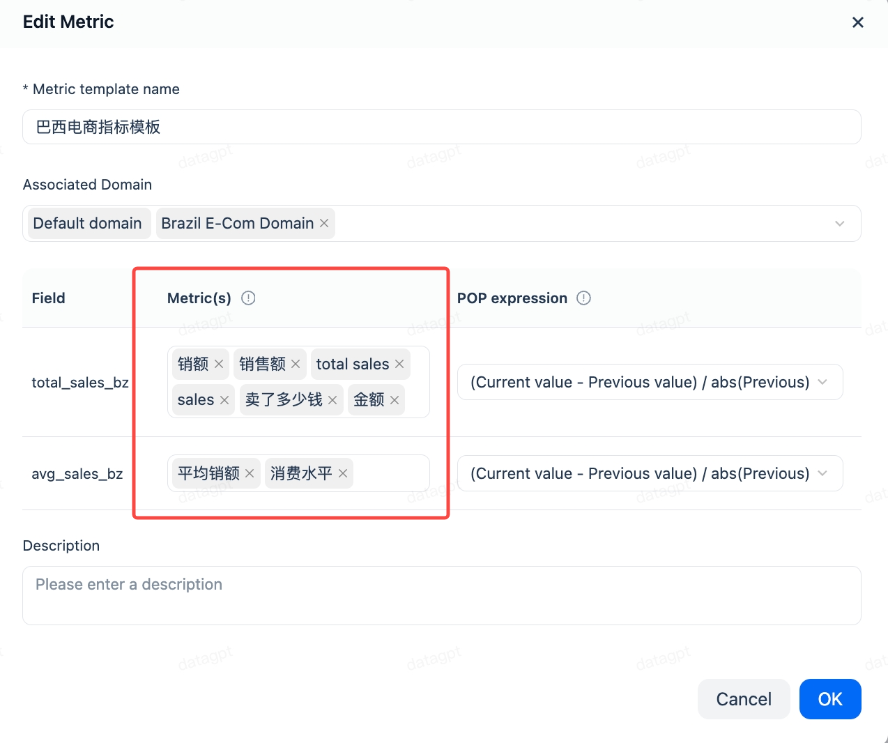 指标为聚合函数或者聚合函数的计算结果,答案构建器为 SQL 模板定义,为预定义对象。基于指标与答案构建器的回答问题会使准确率大幅提升,如果对于问答准确率有严格要求,建议预先定义好。指标支持别名,用于匹配更多的表达方式。请参考指标与答案构建器
