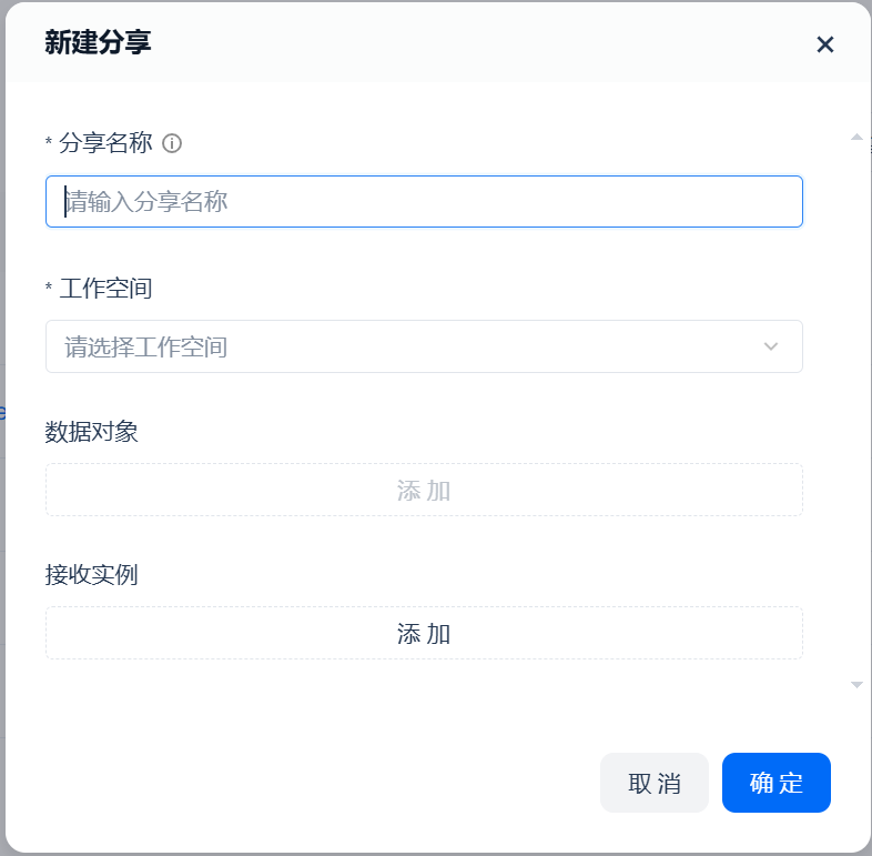 - 创建share对象的工作空间决定了该share对象所能添加的数据对象范围。不支持跨工作空间添加数据对象。