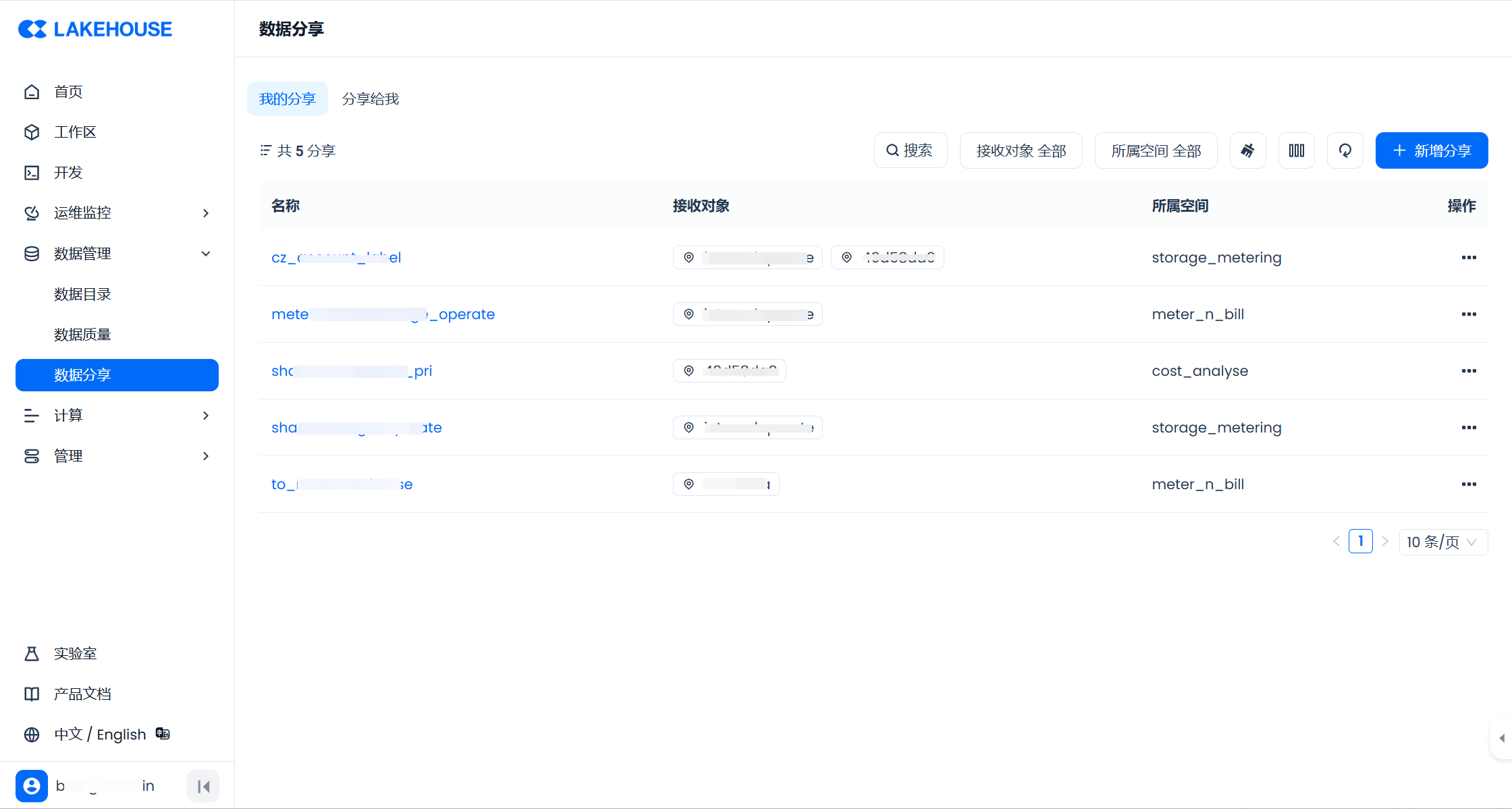 所有当前服务实例内已创建的数据分享(share)对象,均在“数据分享”列表页显示。具备服务实例管理员角色(instance_admin)或工作空间管理员角色(workspace_admin)的用户,可以查看数据分享(share)对象列表。