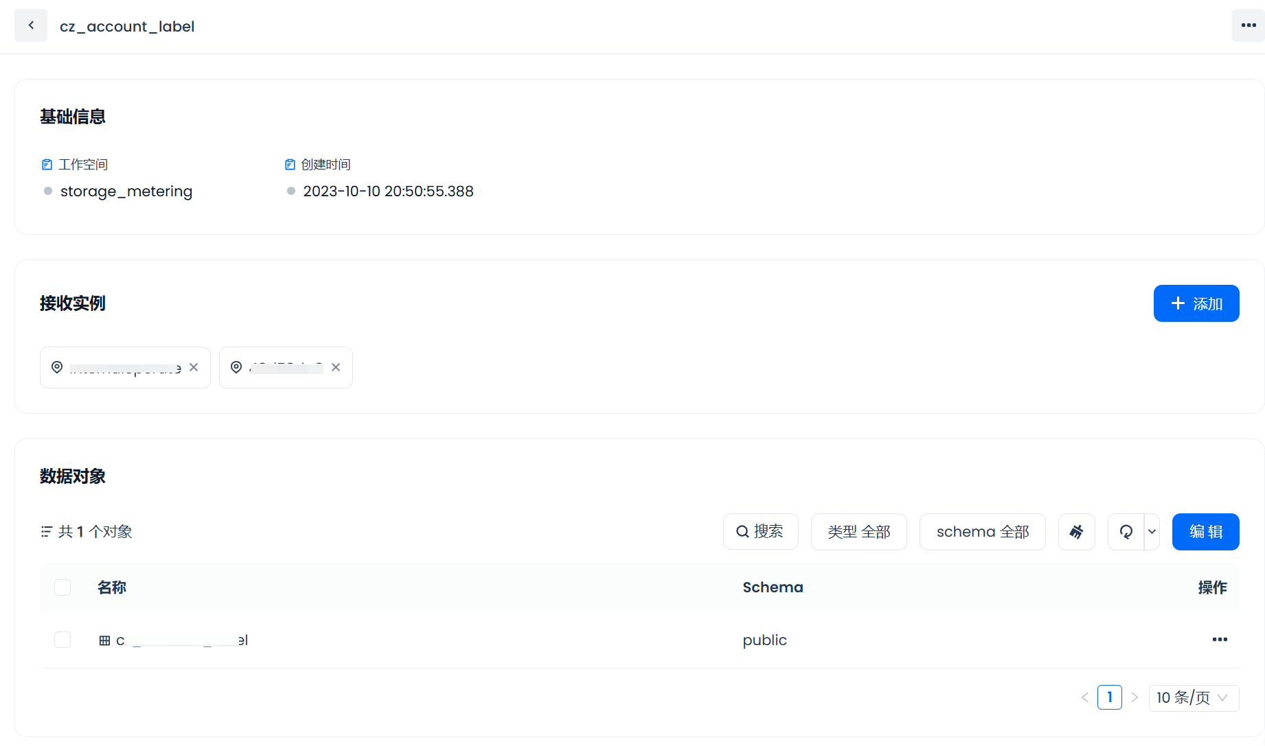 在“数据分享”列表页显示点击具体的数据分享名称,即可查询该数据分享的详细信息,包括基础信息、接收分享的服务实例以及分享的数据对象。具备服务实例管理员角色(instance_admin)或工作空间管理员角色(workspace_admin)的用户,可以查看数据分享(share)对象的详情。